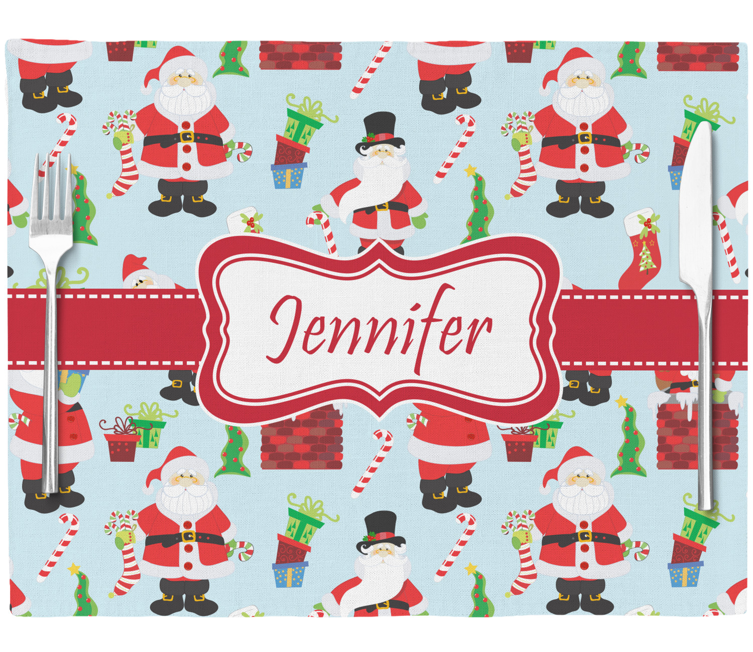 Believe in Santa Claus? Whether you do or not, this design is absolutely adorable with the background that has a cheerful Santa Claus all decked in his red and white, climbing down a chimney to leave presents upon presents and endless candy canes under your Christmas tree. The ribbon and label are red, and the label is the perfect place to put your name or text for personalization.