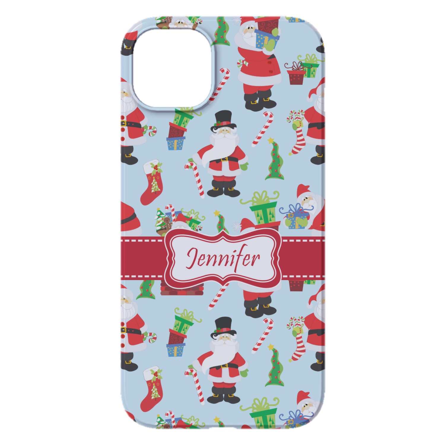 Believe in Santa Claus? Whether you do or not, this design is absolutely adorable with the background that has a cheerful Santa Claus all decked in his red and white, climbing down a chimney to leave presents upon presents and endless candy canes under your Christmas tree. The ribbon and label are red, and the label is the perfect place to put your name or text for personalization.