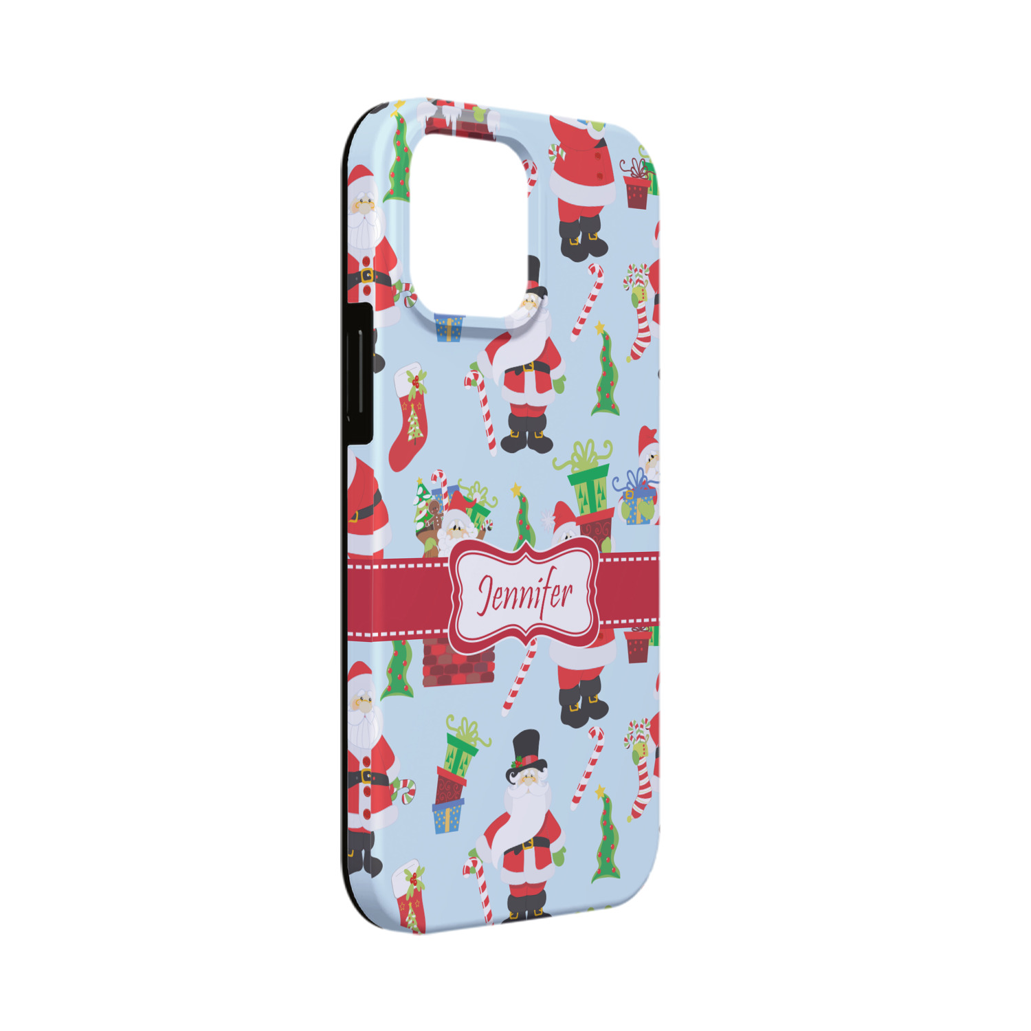 Believe in Santa Claus? Whether you do or not, this design is absolutely adorable with the background that has a cheerful Santa Claus all decked in his red and white, climbing down a chimney to leave presents upon presents and endless candy canes under your Christmas tree. The ribbon and label are red, and the label is the perfect place to put your name or text for personalization.