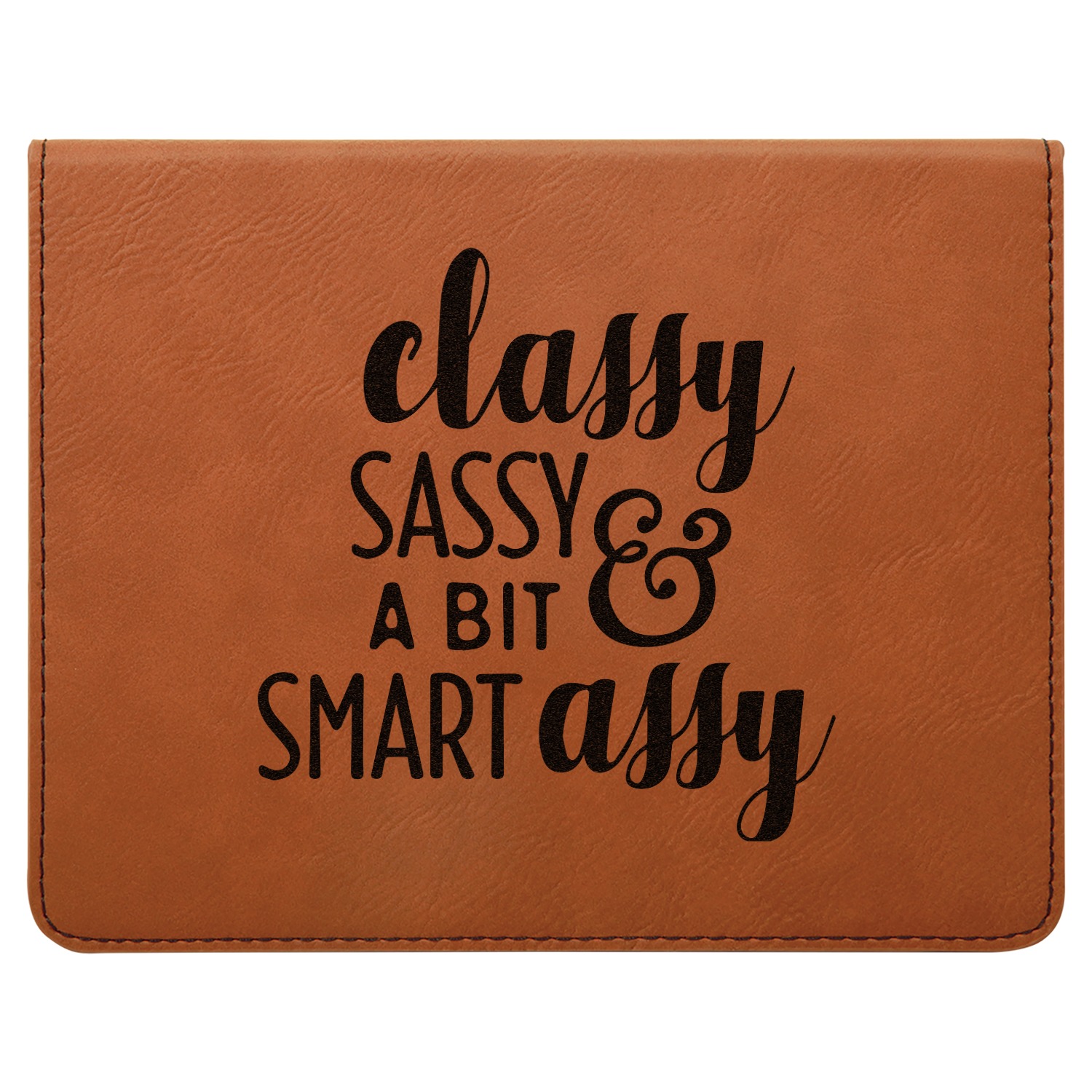 This set includes a wine stopper, pourer, drip ring, and a corkscrew! The exterior of the box is a gorgeous, cognac-brown leatherette, while the interior is covered in a black, velvety material. Four foam indentations, unique to the shape of the wine tool, are found at the bottom half of the box's interior. The tools fit snugly into each of their designated spots, and the foam material helps to protect the integrity of your tools. Each of the wine gadgets features a bamboo accent, with the location and style depending on the tool itself. We laser engrave your personalized design onto the lid of the box, which easily flips open and is secured closed by a small magnet. The wine accessories box measures at 7 by 5.5 inches in total.
