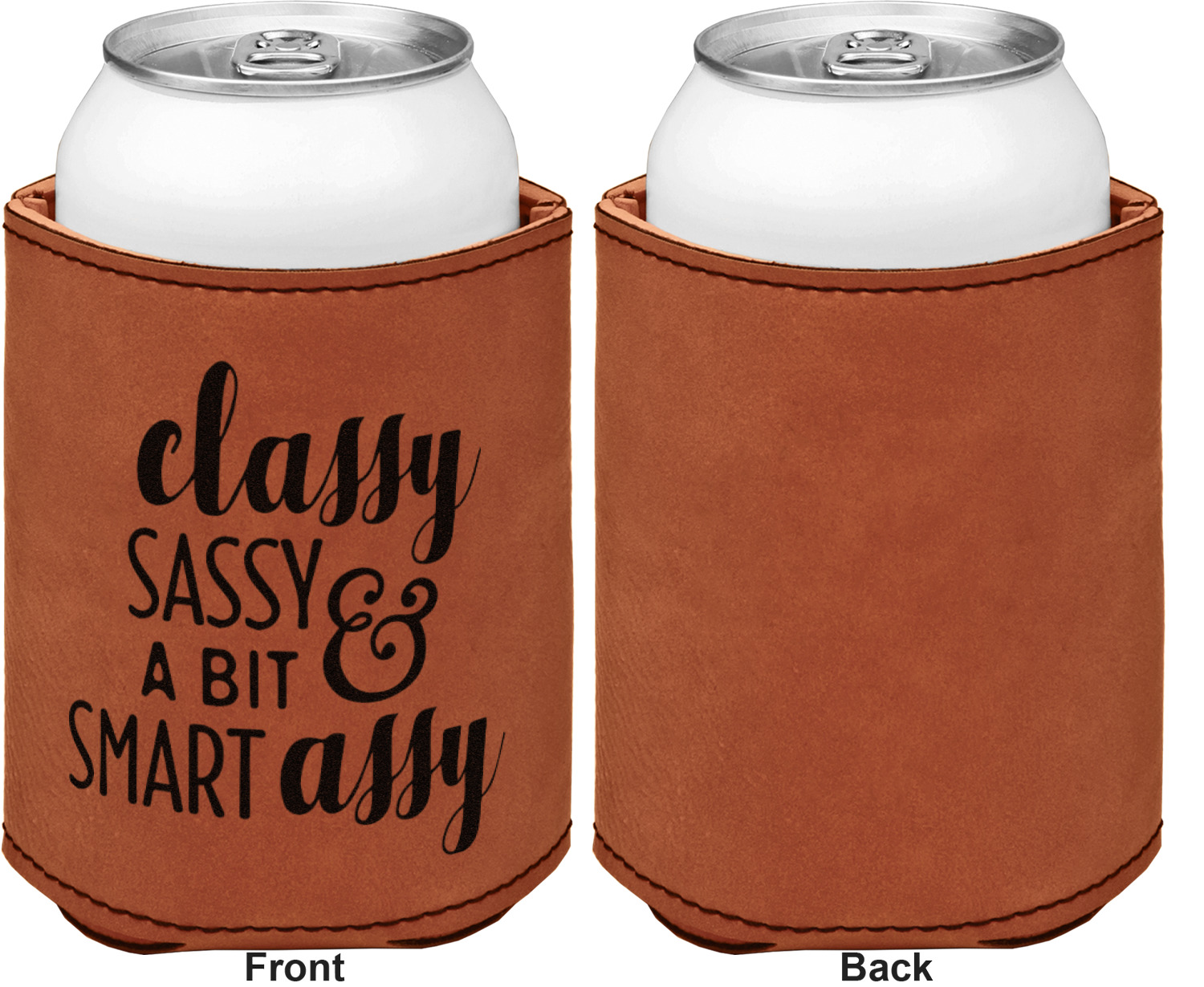 This can sleeve is made from a cognac-brown leatherette and stitched with a sturdy, black thread. A slim padding lines the inside of your can sleeve to allow for a better fit once your drink is inserted. The sleeve itself measures at 4 by 4.5 inches, allowing this custom can sleeve to accommodate most canned drinks. Your personalized design can be engraved on the front and back, or solely the front. When laser-engraved, your design appears as a black coloration which contrasts the leatherette nicely.