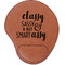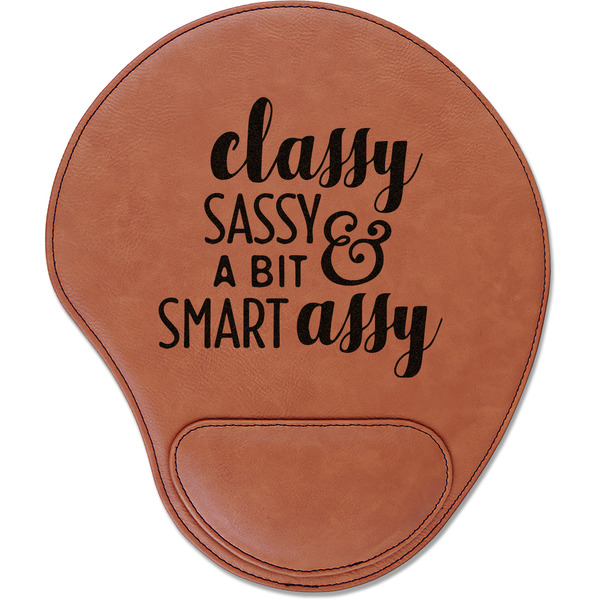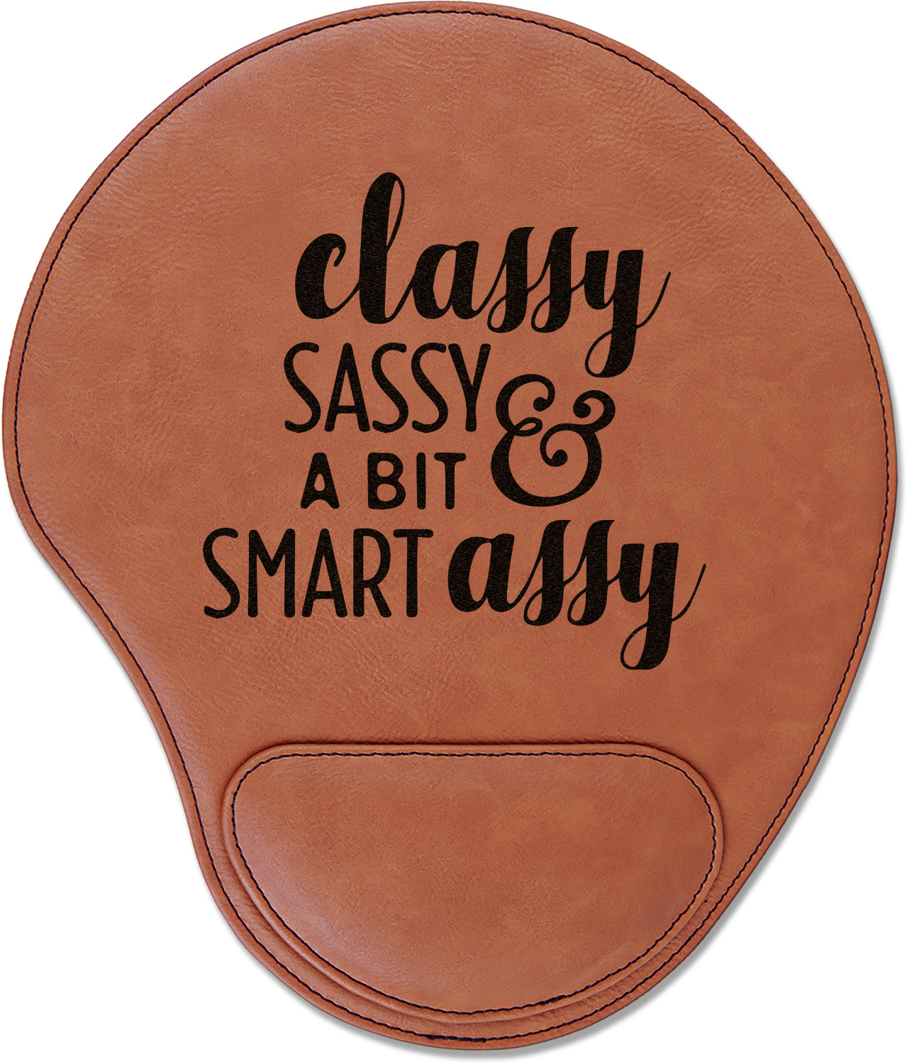 In a rounded shape, this mouse pad is made of a luxurious, cognac-colored leatherette. The nature of this material allows your mouse to glide smoothly across its surface. Strong stitching lines the edges to guarantee stability and strength. As added support for tired wrists, your personalized mouse pad features a supportive wrist rest at its bottom. This model measures at 10.25" x 9", while its wrist pad is approximately 5" x 2.75", with a thickness of 0.75". Your personalized design is laser engraved into the front face of this mouse pad.