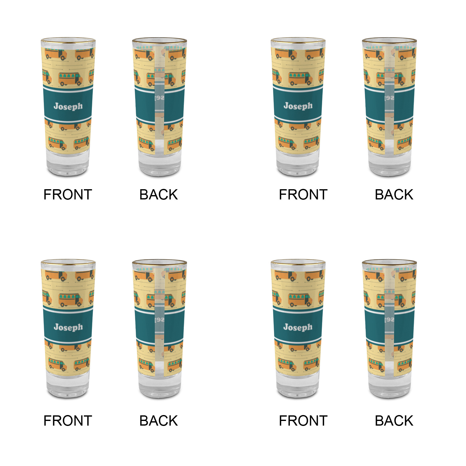 These glass shooter glasses are printed in full color with the design of your choice. These are a tall shooter 2 oz size and stand 4" tall. The print is a full wrap design to boldly display your personalization.