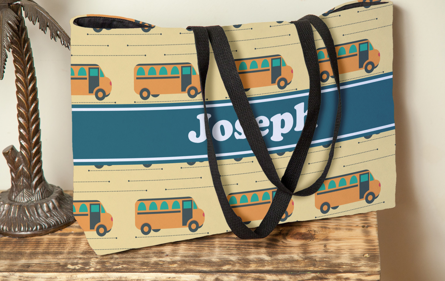 These beach totes are handmade here in the USA. Fabric is printed with your design. The tote is then sewn from the fabric pieces, lining and handles added.