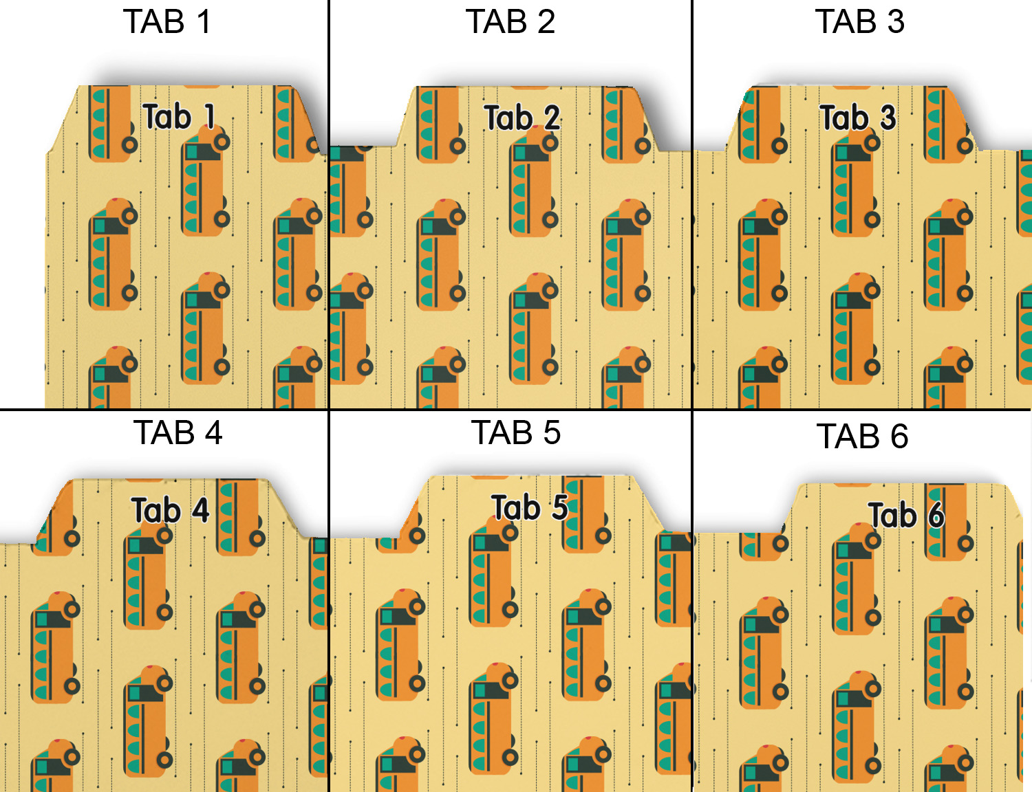 Whether you use binders at school or at work, we have designs to suit all of them. Available in 5 or 6 tab sets, you are sure to find a set to suit your needs. The back of each one is white and can be used to take notes, write vital information on, etc.