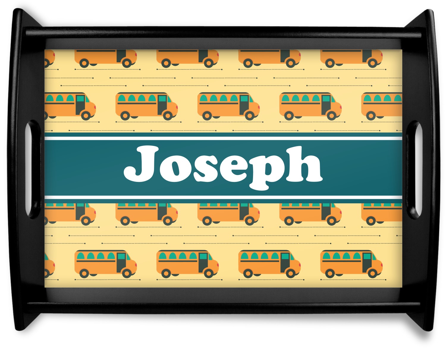 This serving tray with handles features square edges and two rounded sides, creating a very modern look. Each side is fabricated from a beautifully cut, natural wood. The bottom of the interior of the tray displays your customized design in bright, vibrant color. The tray is sold in both a black color and a natural wood look. Each variation of the wood serving tray has two sizes: Small, which is 14" x 10" x 2.25", and Large, which is 19.5" x 13.5" x 2.75".