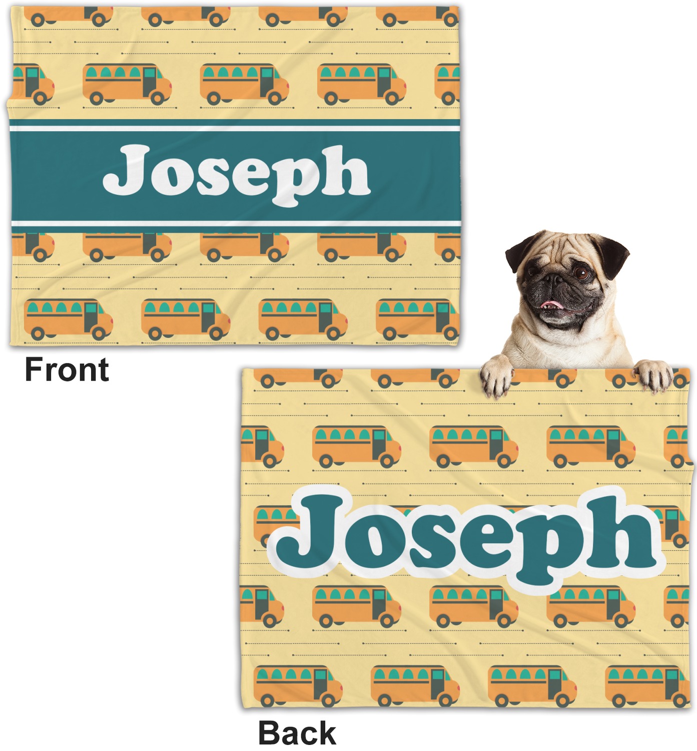These dog blankets are crafted from a gentle, soft-to-the-touch, minky material. We print your customizations, either matching or differing, on both the top and underside of the blanket. These personalized dog blankets are available in two sizes: regular and large. Our regular size, at 40" x 30", accommodates small and some medium size dogs. At 60" x 50", our large dog blanket is a better fit for bigger breeds. Though specialized for dogs, these blankets still make a thoughtful gift for your favorite feline, or any other pet in mind!