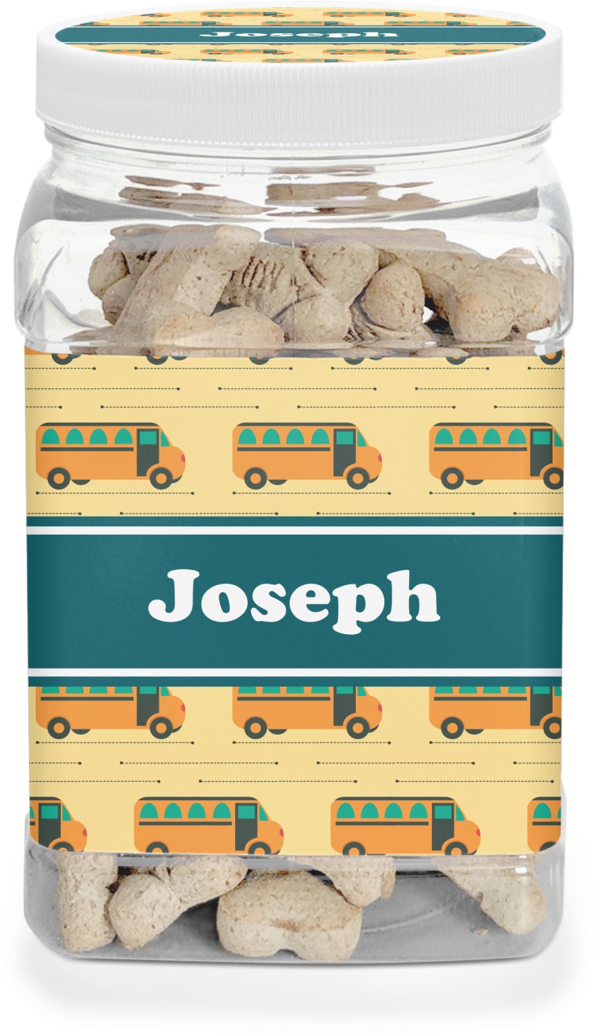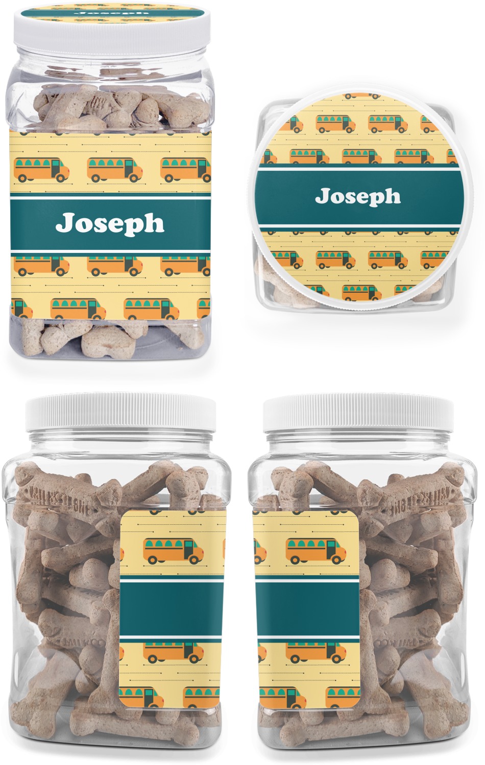 This half gallon jar, made from a sturdy plastic, is the perfect way to keep treats from any naughty pet paws, while still keeping them ready on hand for when your pup performs an impressive trick. This dog cookie jar features a screw-on, white lid that displays your personalized design on a vinyl sticker. We apply another customized sticker that wraps around the front and sides of the jar. Our dog treat jar also has indentations on the rear ends of the sides, which allows for convenient handling, and its square frame allows for easy storage.
