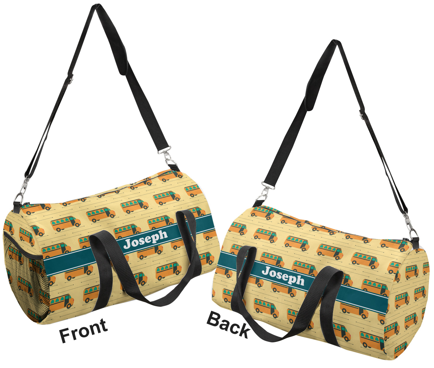 This duffle is a sturdy bag made of a canvas material. It comes in two sizes: Small (19"W x 9.5"H x 9.5"D) and Large (23"W x 12"H x 12"D). The bag is a cylindrical shape with a black adjustable strap and two handles. On one side is an elastic pouch to put a waterbottle or other small item. Your product will be sublimated with your design and is able to be designed on the front, back, and sides. Be sure to remember that the straps may cut into parts of your design if you upload your own artwork.