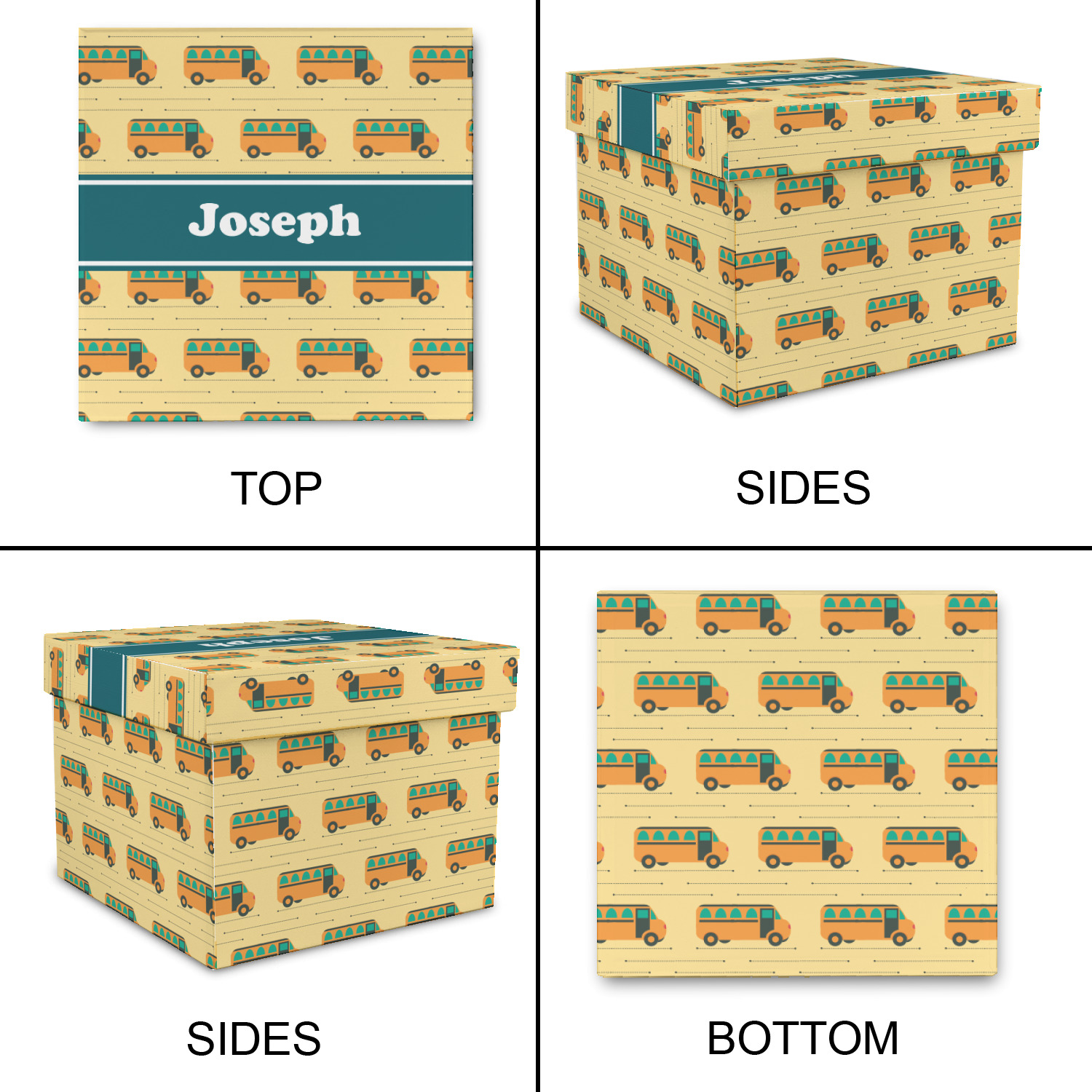 Filled with different shades of yellow, this design will be a cheery one to take to school on their first day! The school buses almost seem like they are in motion on the light yellow background. The teal ribbon is a nice complimentary color and really pops on top of the yellows.