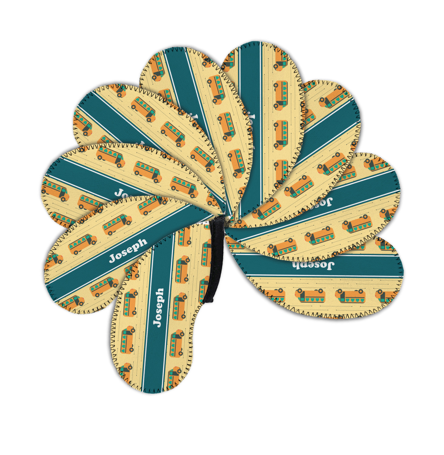 Filled with different shades of yellow, this design will be a cheery one to take to school on their first day! The school buses almost seem like they are in motion on the light yellow background. The teal ribbon is a nice complimentary color and really pops on top of the yellows.
