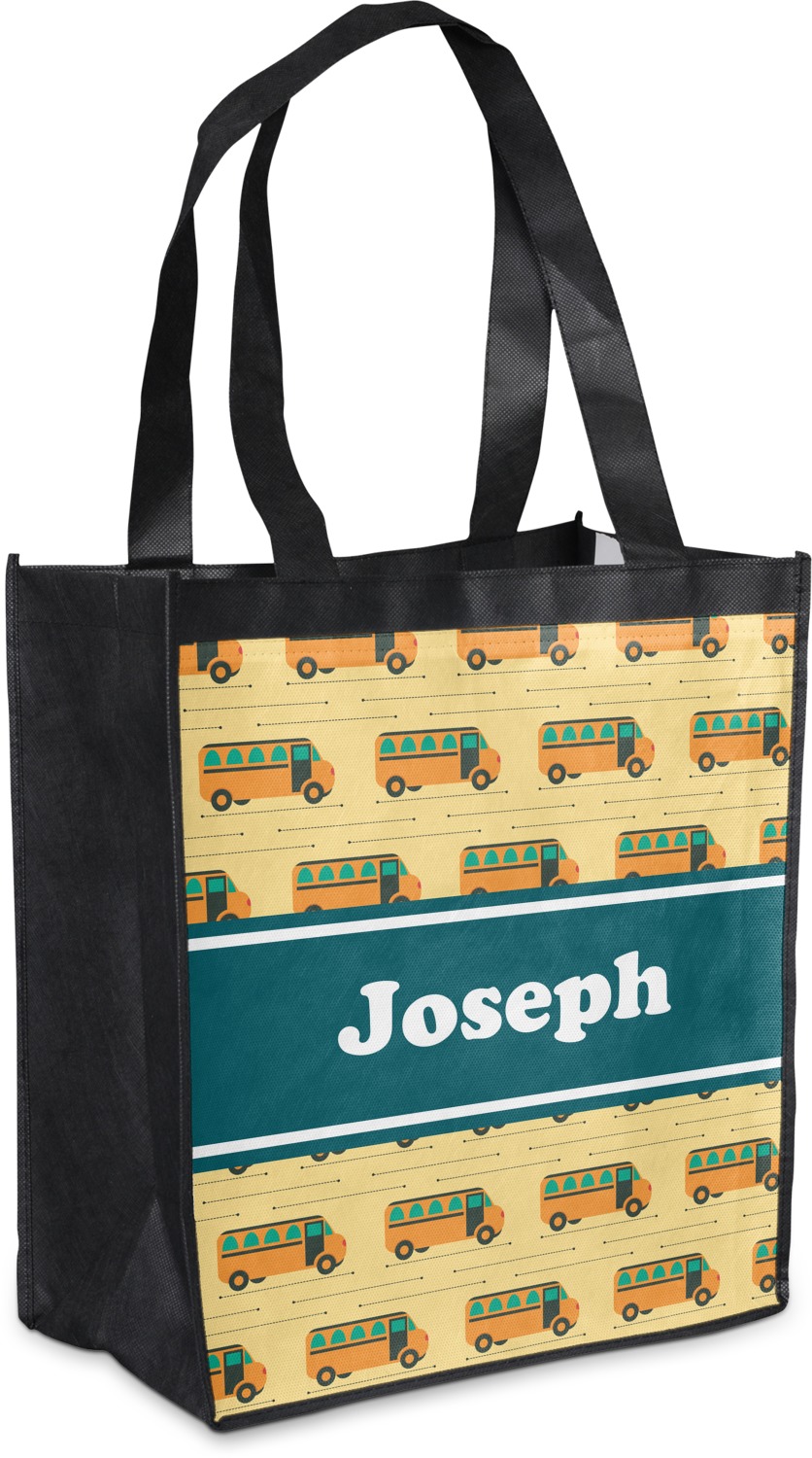 Made from a durable, biodegradable material, these reusable shopping bags can support up to 30 pounds of weight. With two large handles, measuring at 8.5 inches each, these personalized tote bags are easy to carry to your vehicle or home. The bag itself is 12 by 13.5 inches, and can expand to a depth of 7 inches. Your customization is printed on both the front and back, while the remaining sides, trim, and handle are a sleek, charcoal black.