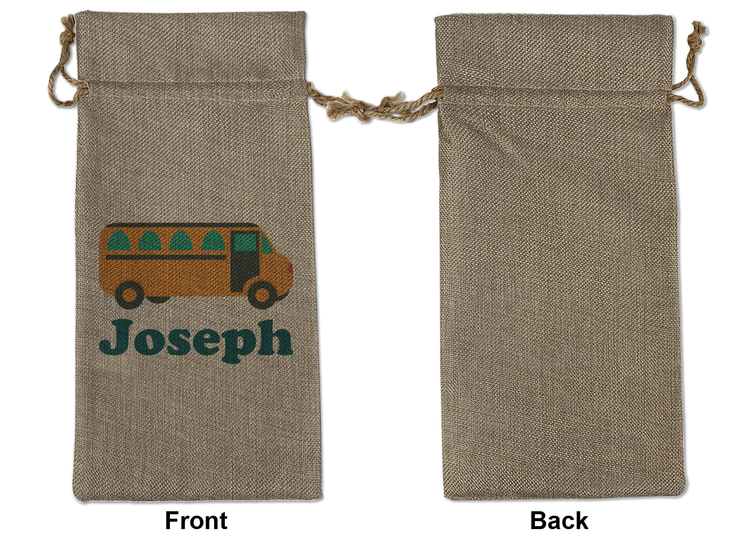 We sell our Burlap Gift Bags in 3 variant sized bags. Made with burlap polyester, each personalized bag can be secured with a twine drawstring pull. Your custom design is available to print on one side or both sides - completely up to you! The sizes of the bags measure approximately 4.5" x 6.5" for the smallest size, 6.5" x 8.0" for the medium size, and 6.5" x 13.5" for the large-sized bag.
