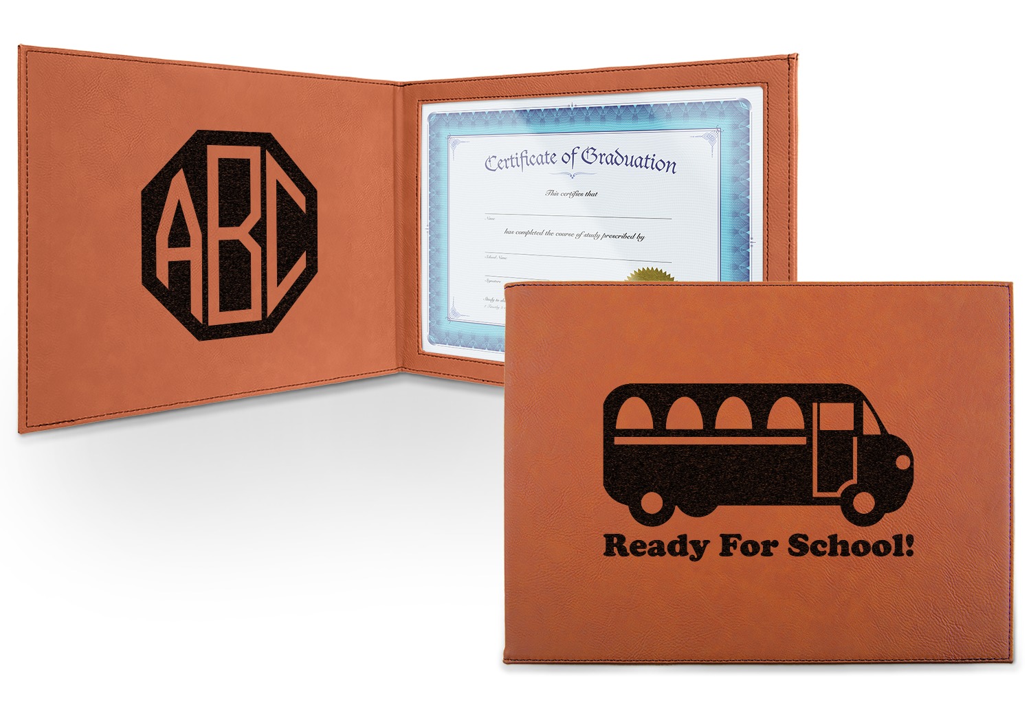 This cognac-colored, leatherette certificate jacket is the ideal way to display or store your hard-earned certificate. When closed, the custom certificate holder measures at 12 by 9 inches. The interior of the certificate cover includes a clear, vinyl window to encase your diploma. The window measures at around 10.5 by 7.5 inches and can accommodate a diploma that measures at up to 8.5 by 11 inches. You can either choose to have your customization laser engraved on the front and interior, or solely the front.