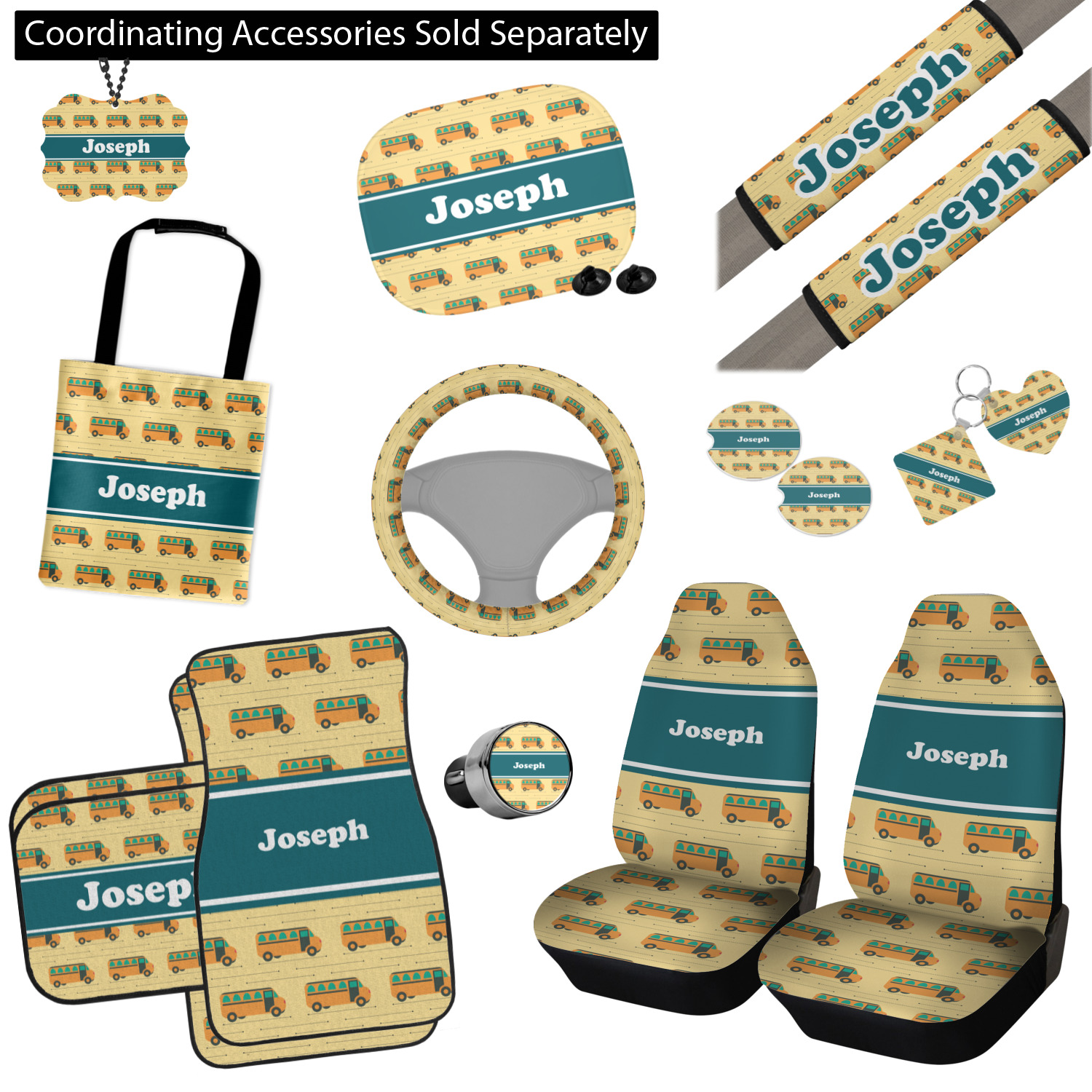 Filled with different shades of yellow, this design will be a cheery one to take to school on their first day! The school buses almost seem like they are in motion on the light yellow background. The teal ribbon is a nice complimentary color and really pops on top of the yellows.