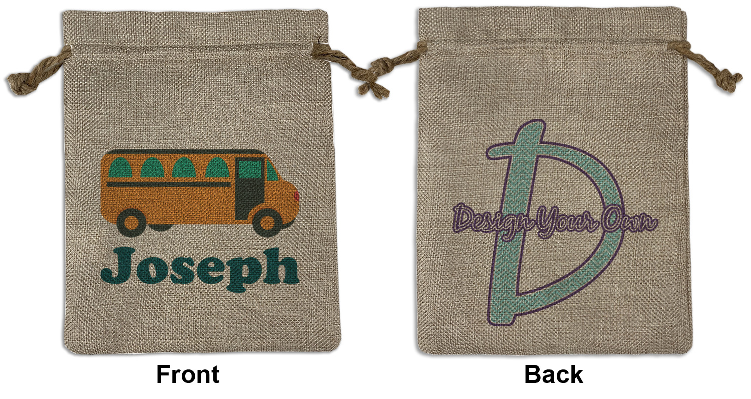 We sell our Burlap Gift Bags in 3 variant sized bags. Made with burlap polyester, each personalized bag can be secured with a twine drawstring pull. Your custom design is available to print on one side or both sides - completely up to you! The sizes of the bags measure approximately 4.5" x 6.5" for the smallest size, 6.5" x 8.0" for the medium size, and 6.5" x 13.5" for the large-sized bag.