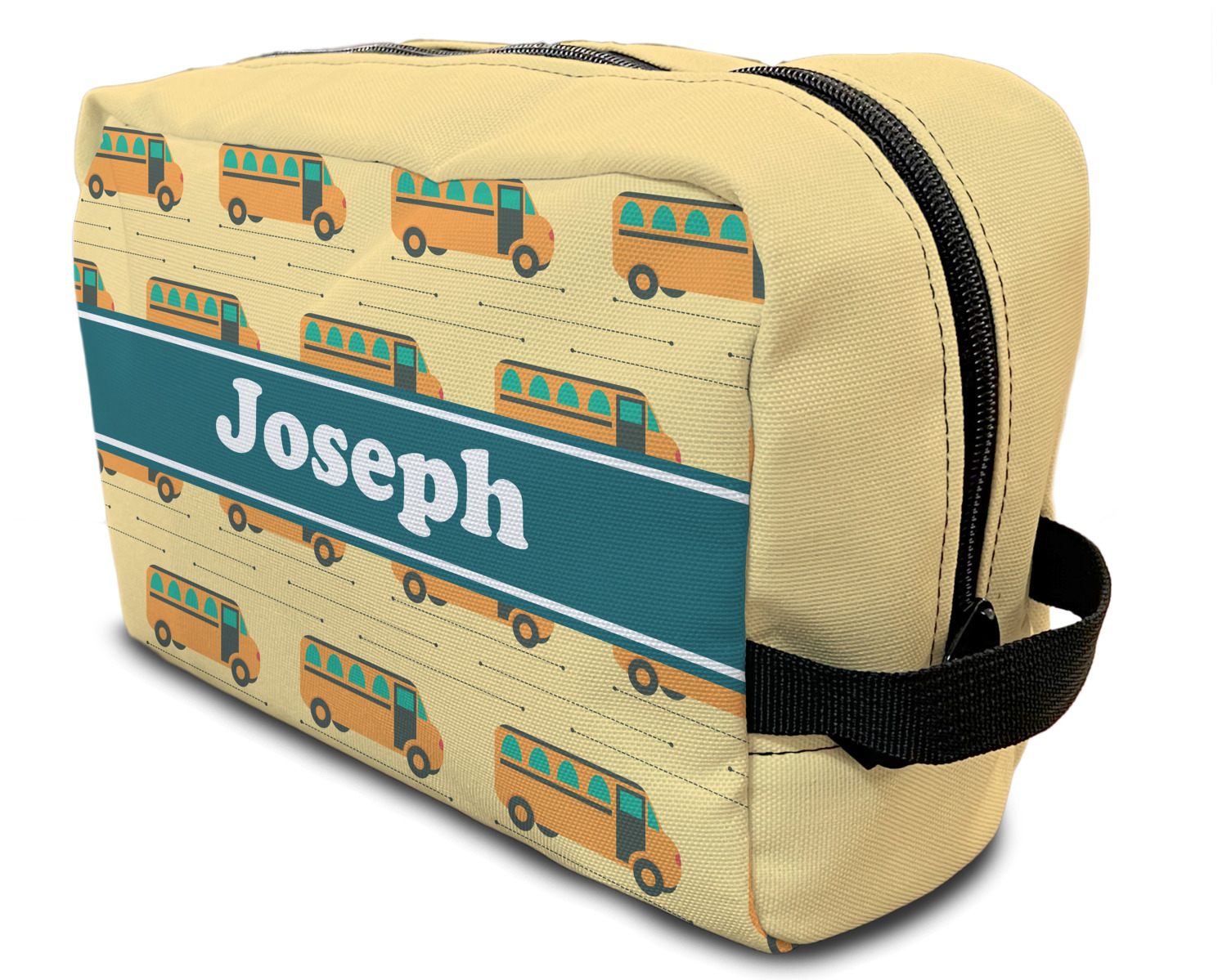 Our toiletry bag has the traditional dopp kit design i.e. a side to side zippered closure, giving you easy access to all the contents inside and a sturdy handle on one side of the bag. The canvas fabric for dopp kits is printed, then cut and sewn here in the USA.