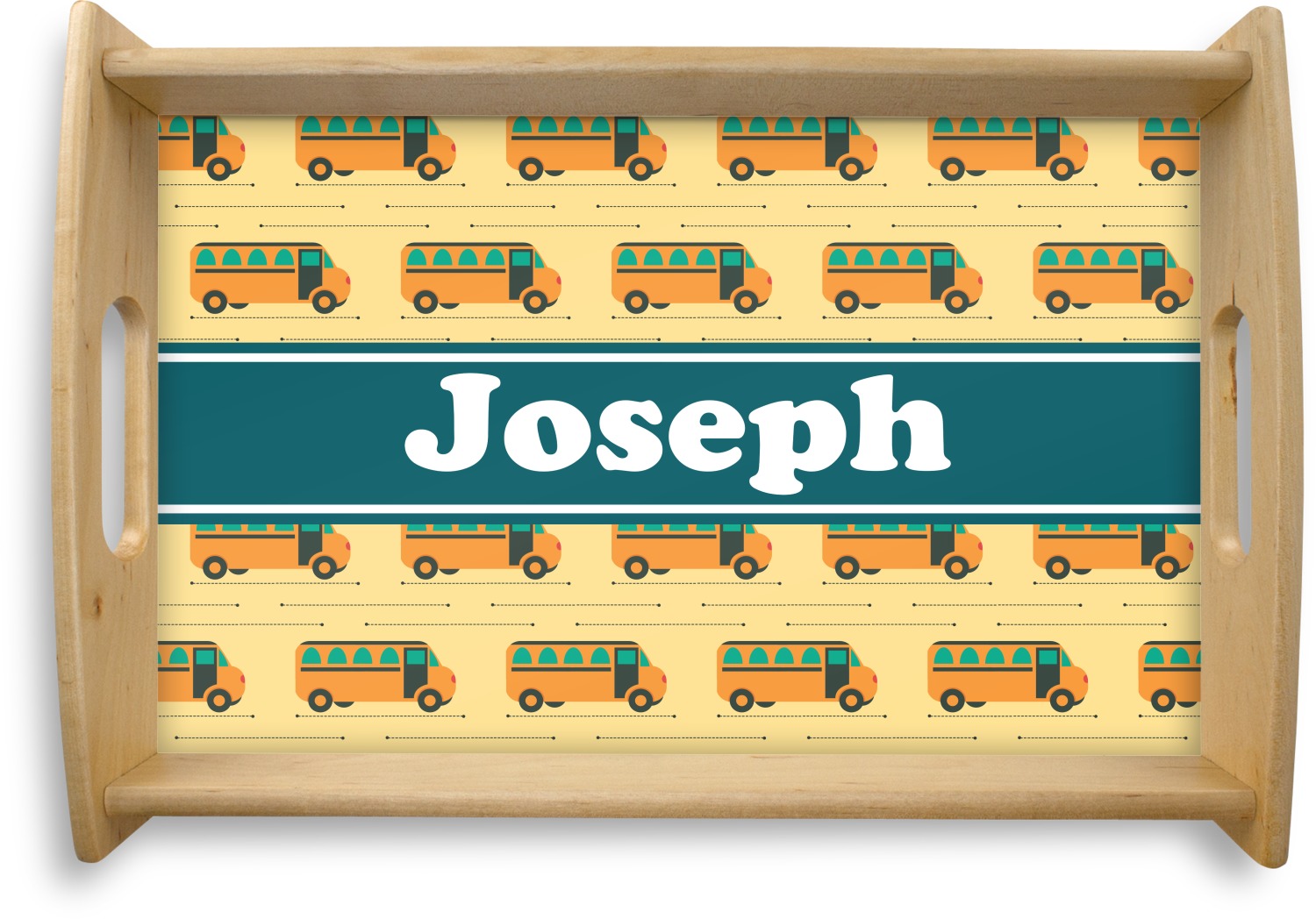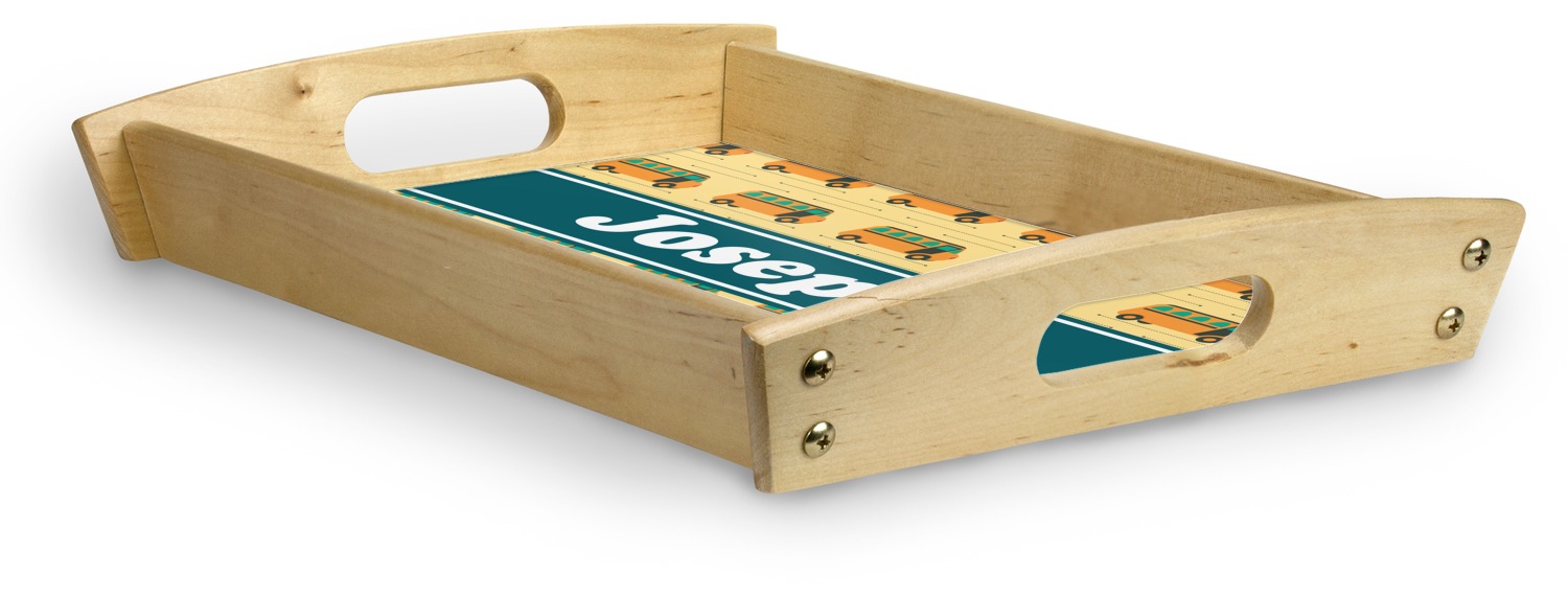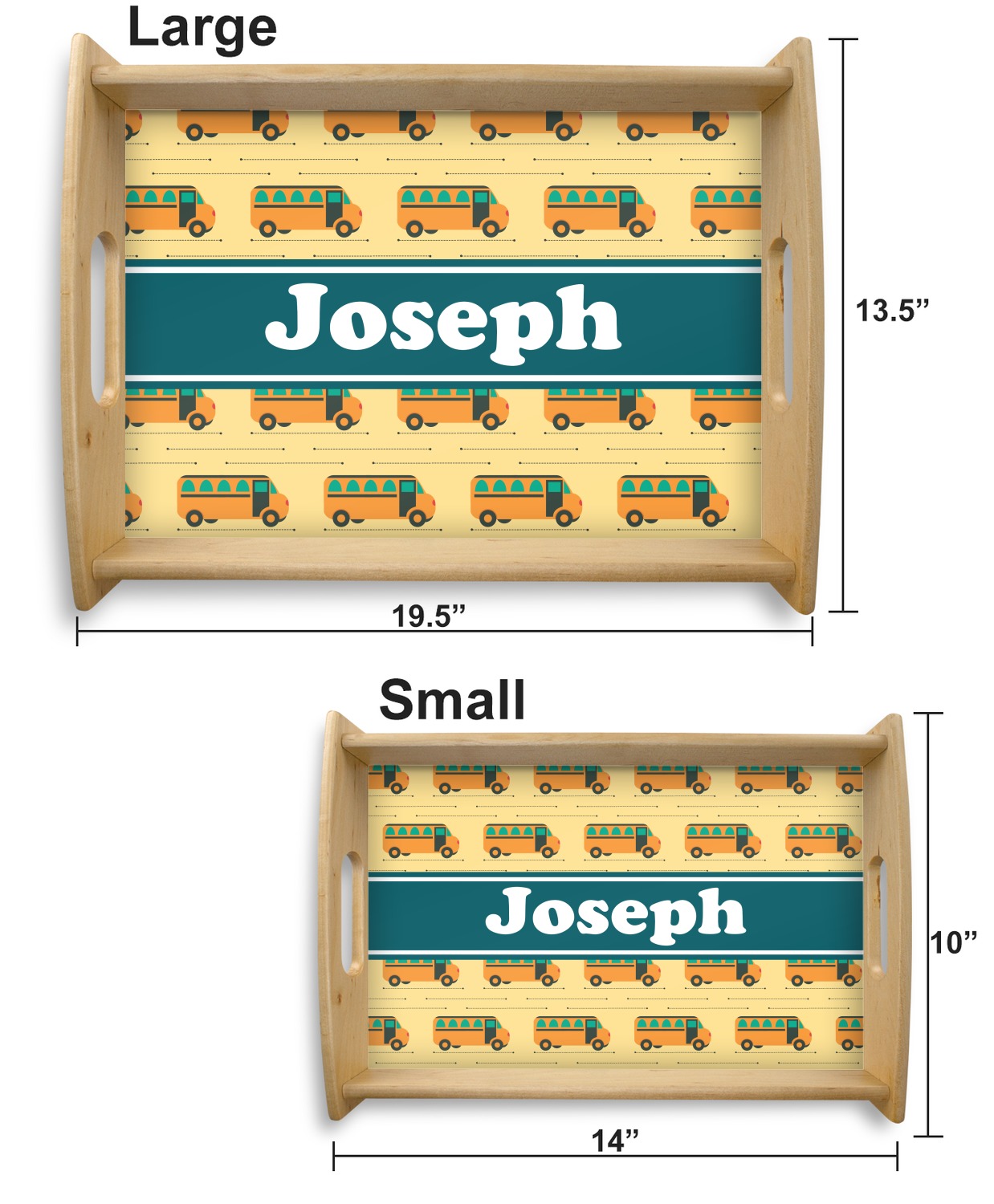 This serving tray with handles features square edges and two rounded sides, creating a very modern look. Each side is fabricated from a beautifully cut, natural wood. The bottom of the interior of the tray displays your customized design in bright, vibrant color. The tray is sold in both a black color and a natural wood look. Each variation of the wood serving tray has two sizes: Small, which is 14" x 10" x 2.25", and Large, which is 19.5" x 13.5" x 2.75".