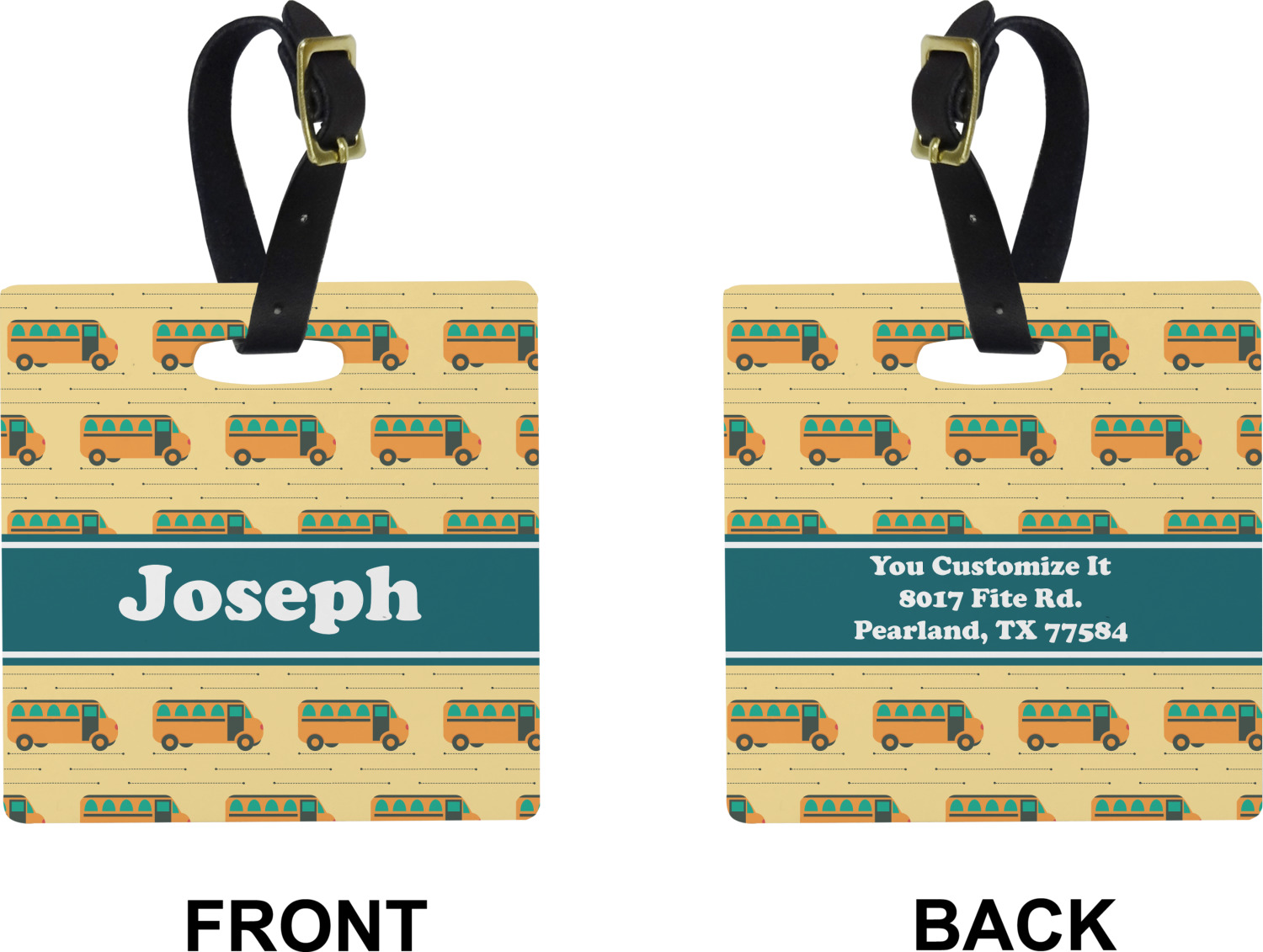 These personalized bag tags are sold in a variety of shapes, so that you may find the product that meets your vision exactly. We sell a round luggage tag, which measures at approximately 4" x 4". Our square luggage tag is about 3.5" x 3.5", while our rectangular version is 2.75" x 4 ".