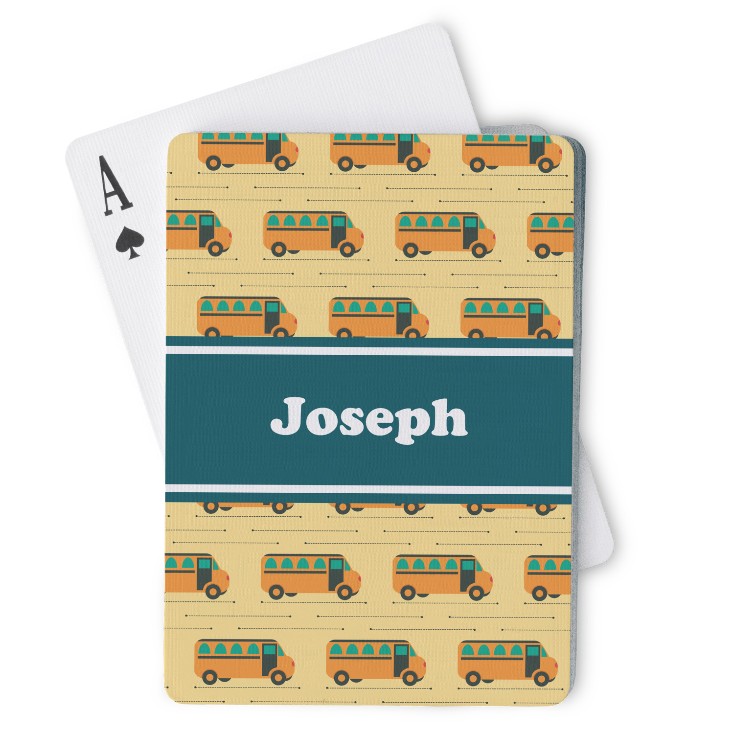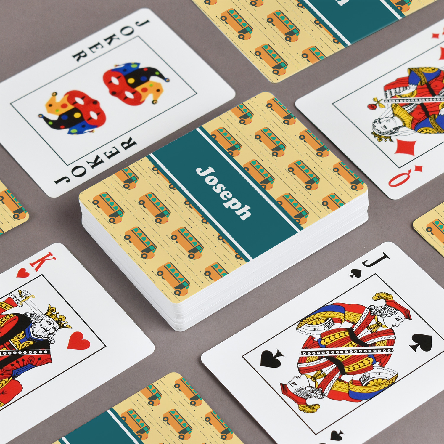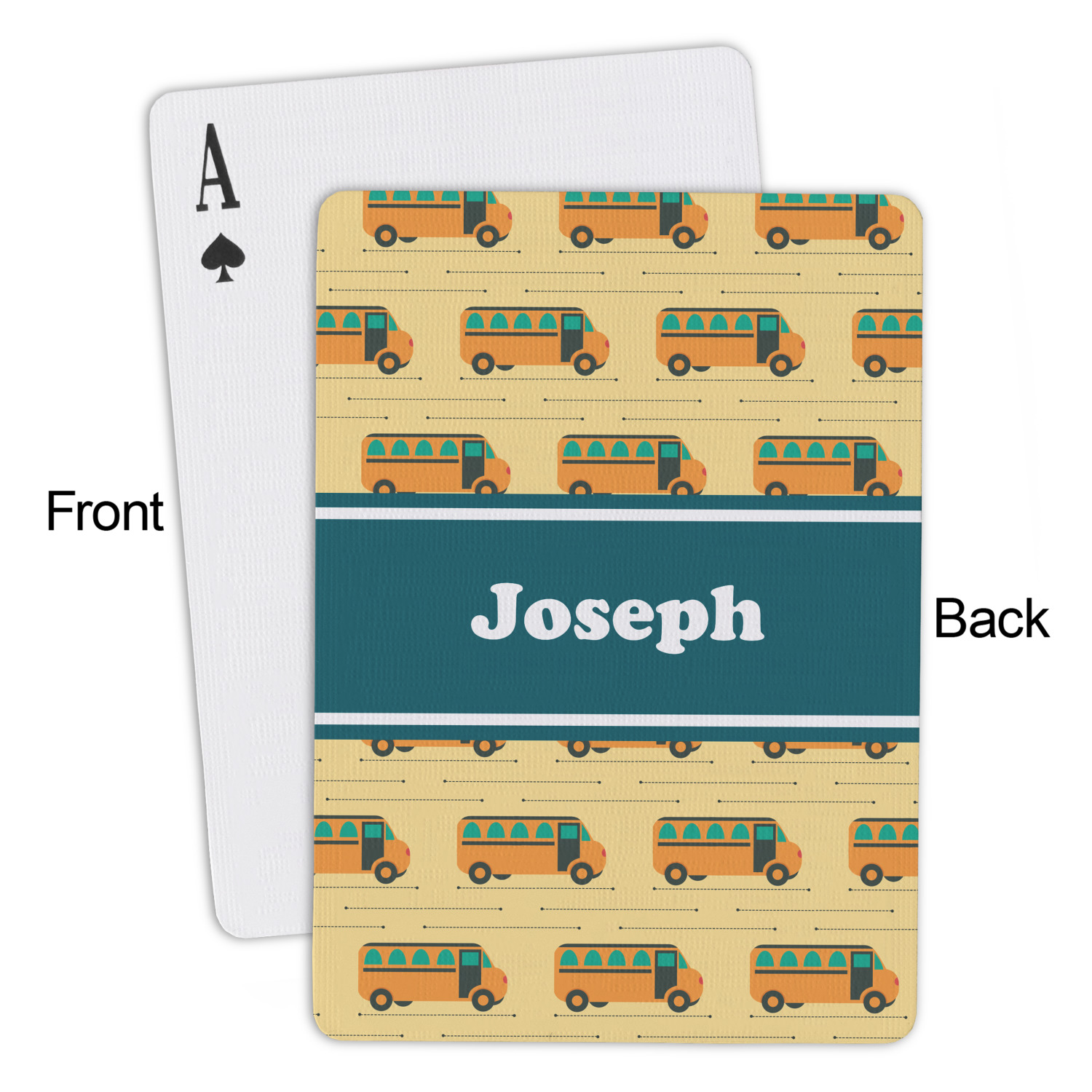 The customization / personalization is printed on the back side. The playing cards have a low gloss coating on both sides. The cards are packaged in a clear plastic box.