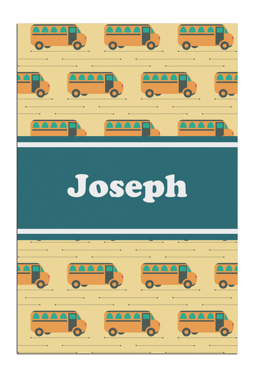 Filled with different shades of yellow, this design will be a cheery one to take to school on their first day! The school buses almost seem like they are in motion on the light yellow background. The teal ribbon is a nice complimentary color and really pops on top of the yellows.