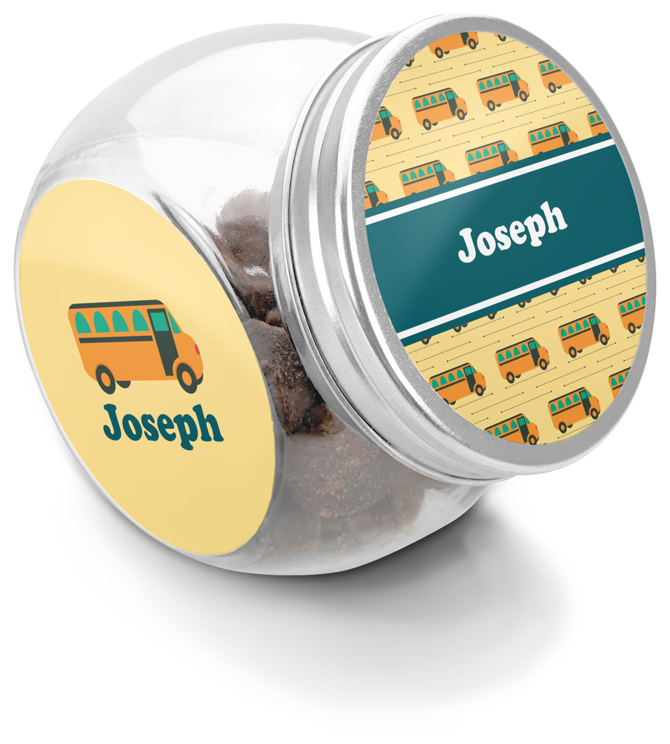 This treat jar is an excellent way to store treats for your favorite canine or feline. Moreover, their delicate, classy appearance makes them a tasteful addition to your countertop's décor. Crafted from clear glass, its unique construction and silver metal, screw-on lid allows for quick and easy access. Three, permanent, vinyl stickers are applied to both sides of the jar and lid, presenting your personalized design. The base of this glass, dog treat jar is 3.4" x 4.75", and the jar stands at 5" tall. Though on the smaller side, this jar is best suited for smaller treats or training treats.