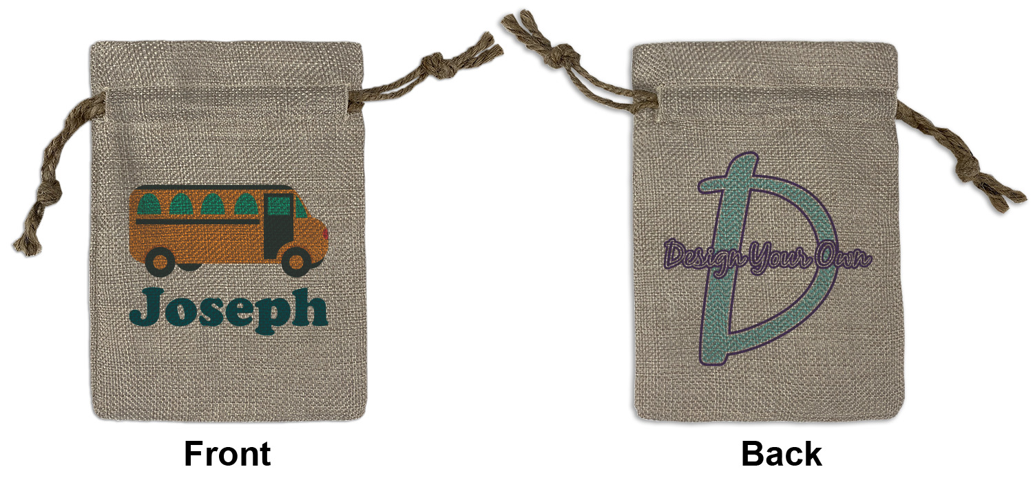 We sell our Burlap Gift Bags in 3 variant sized bags. Made with burlap polyester, each personalized bag can be secured with a twine drawstring pull. Your custom design is available to print on one side or both sides - completely up to you! The sizes of the bags measure approximately 4.5" x 6.5" for the smallest size, 6.5" x 8.0" for the medium size, and 6.5" x 13.5" for the large-sized bag.