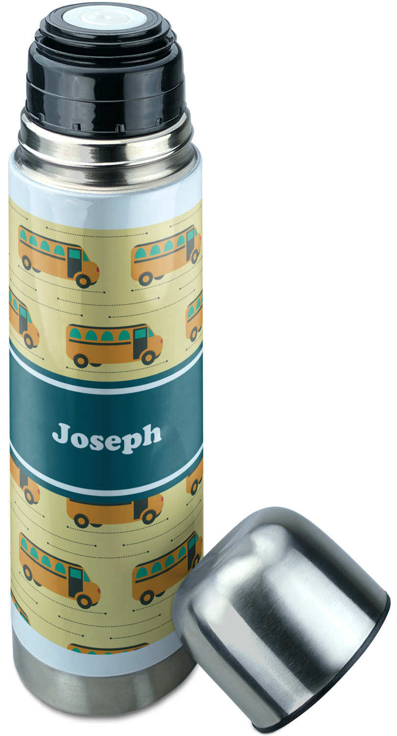 Manufactured from stainless steel, this thermos is built durably and double-walled insulated to preserve the temperature of your drink for hours. It also features a screw off lid that is made to also function as a small cup. Upon unscrewing this part of the thermos bottle, a pop-open, pour feature emerges. This feature allows you to slowly pour your beverage into your lid, ensuring a steady, controlled pour into your lid or other cup. With a capacity of 25 ounces, these large thermoses can hold several servings of your favorite beverage. Your customization is displayed all around the bottle with bright, vibrant color.