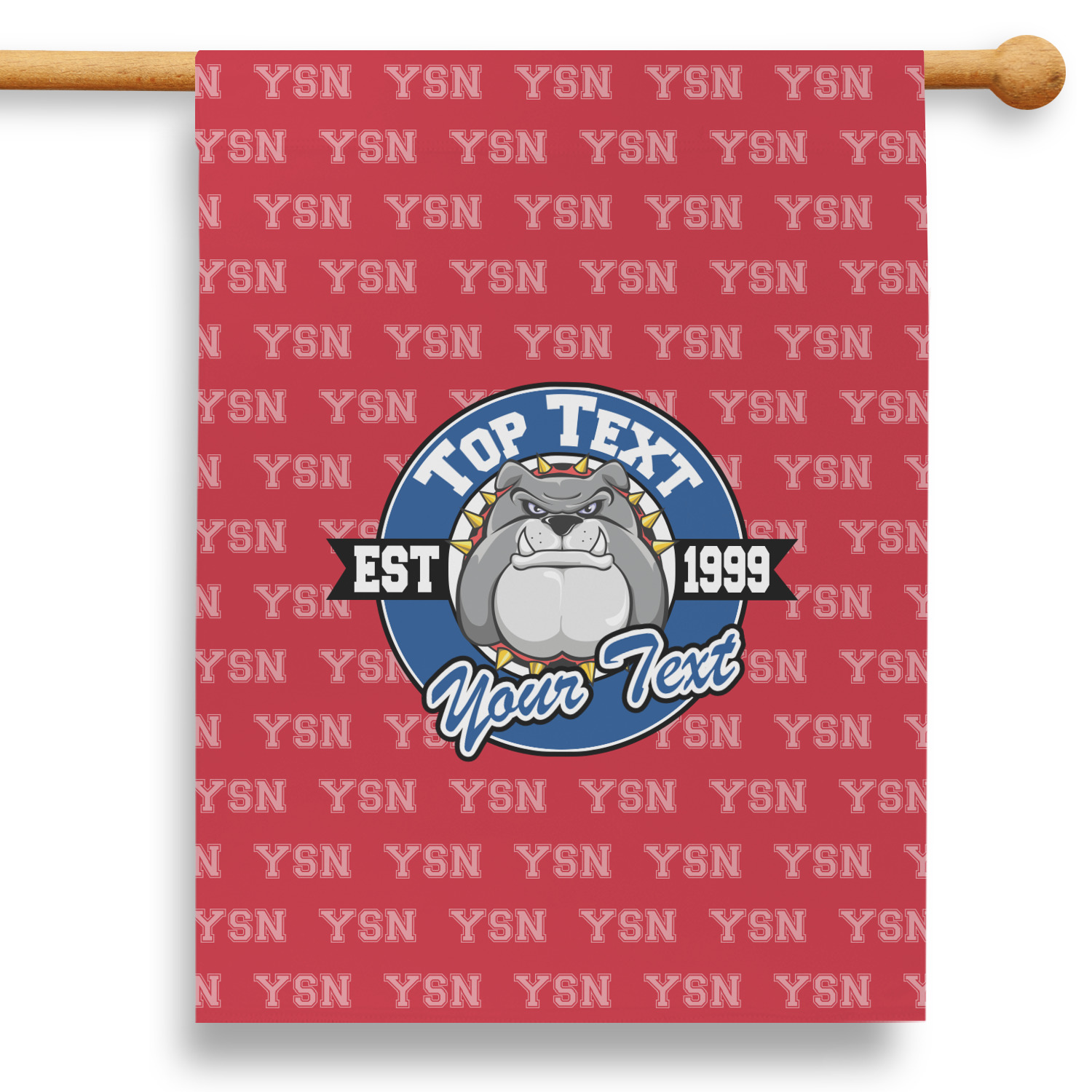 The foreground has a beautiful badge that can be changed to you second school color. There are two locations for the text and one for year your school was established - we recommend putting your High School name on top and your mascot name on the bottom. The mascot face is also customizable. We have 100's of mascots in our system for you to choose from.