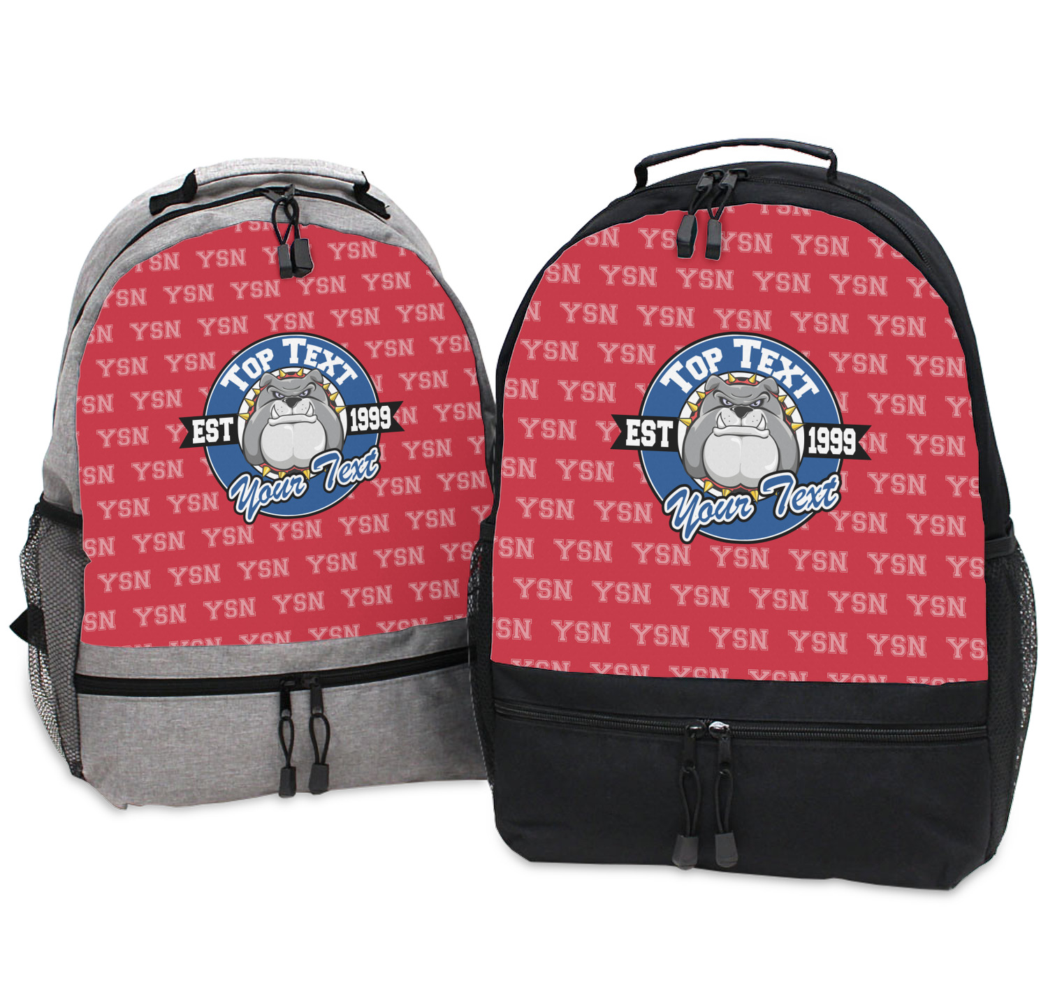 For products that use the background, let's start with the background - we show your school's initials on the red background. You can change the color of the background to your school color, you can change the initial to your school's initial. We also have a background with the mascot, that would look great on this design. And we have 1000's of patterns (e.g.plaid) that you can also use and recolor to your school colors.