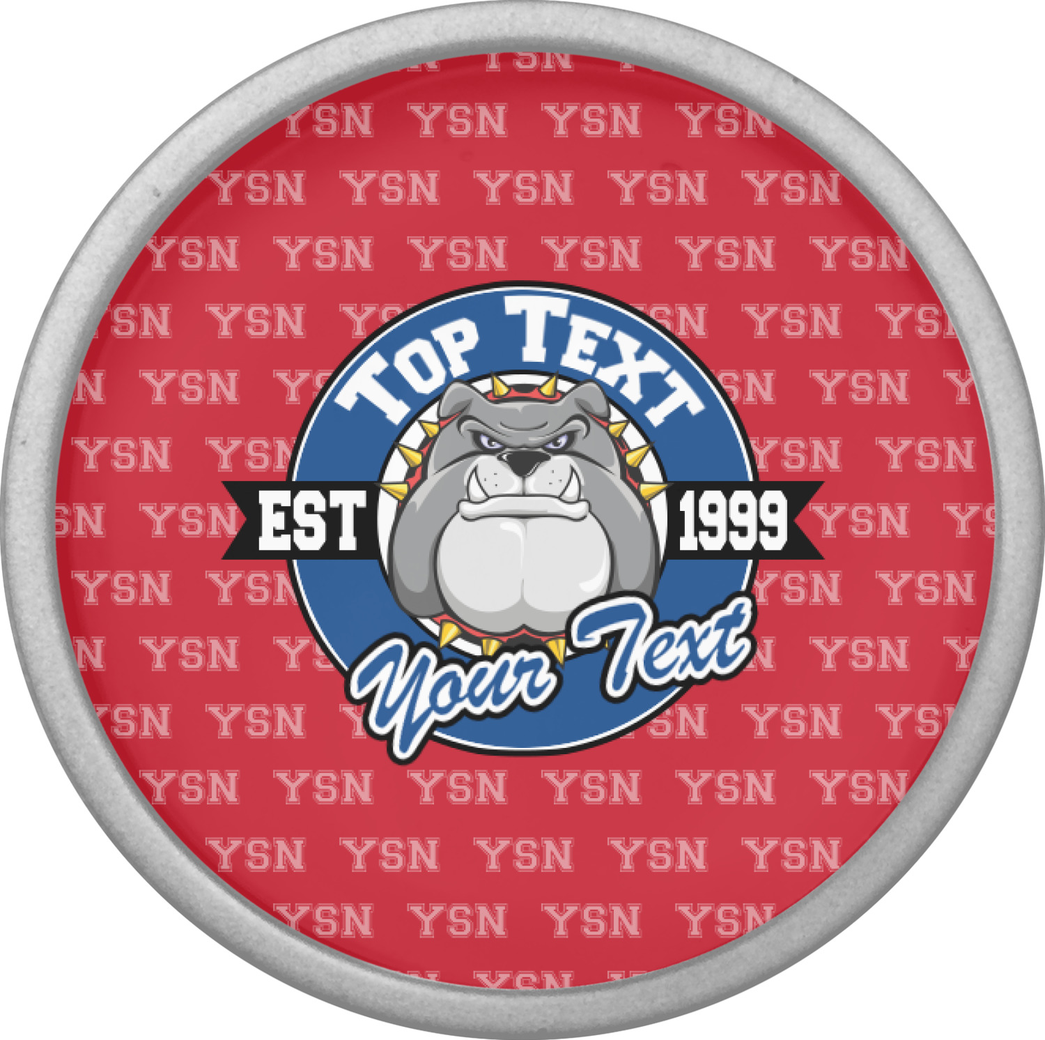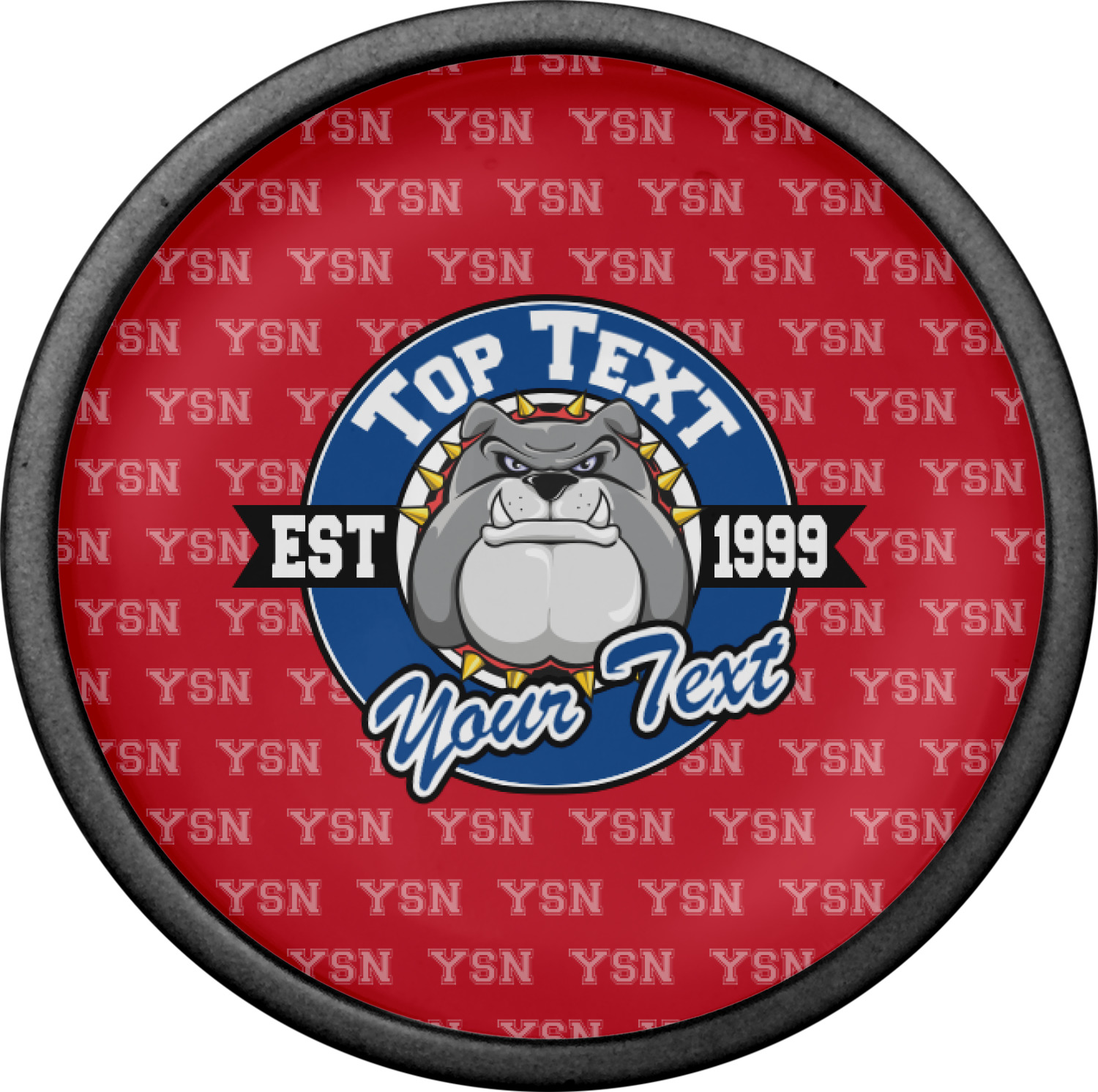 The foreground has a beautiful badge that can be changed to you second school color. There are two locations for the text and one for year your school was established - we recommend putting your High School name on top and your mascot name on the bottom. The mascot face is also customizable. We have 100's of mascots in our system for you to choose from.