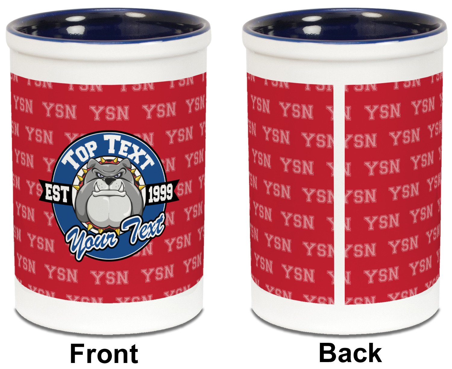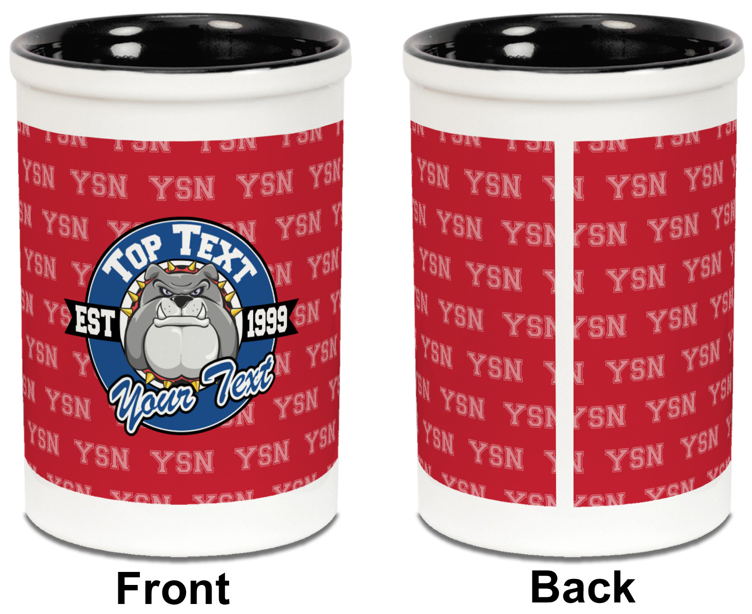 For products that use the background, let's start with the background - we show your school's initials on the red background. You can change the color of the background to your school color, you can change the initial to your school's initial. We also have a background with the mascot, that would look great on this design. And we have 1000's of patterns (e.g.plaid) that you can also use and recolor to your school colors.