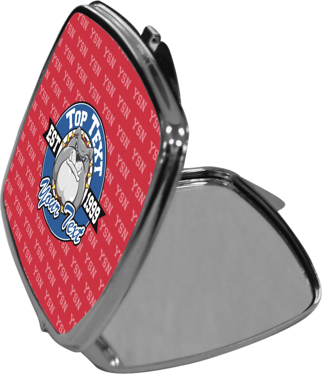 Our compact mirrors are customized with your design on one side. The other side is patterned silver tone metal. Inside, there are two mirrors.