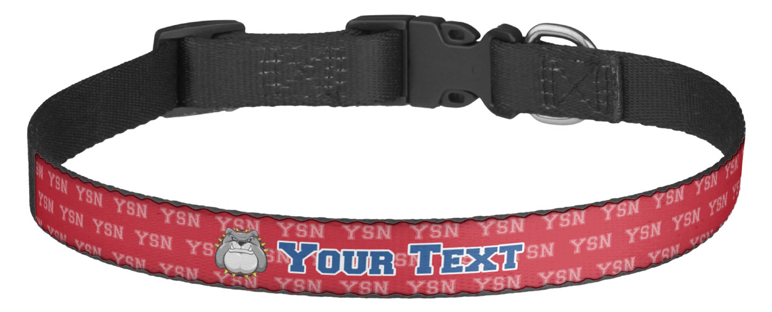 This sturdy collar, made from a durable nylon weave, will outlive your dog's episodes of excited tugging and pulling. Courtesy of its thick plastic buckle and adjuster, this collar is adjustable and accommodating of any dog. Structurally, the collar is a single piece of nylon weave that is sewn together, and features a solid metal loop where you can attach a leash or dog tag. We print and display your dog's name and pattern across the middle of the personalized dog collar.