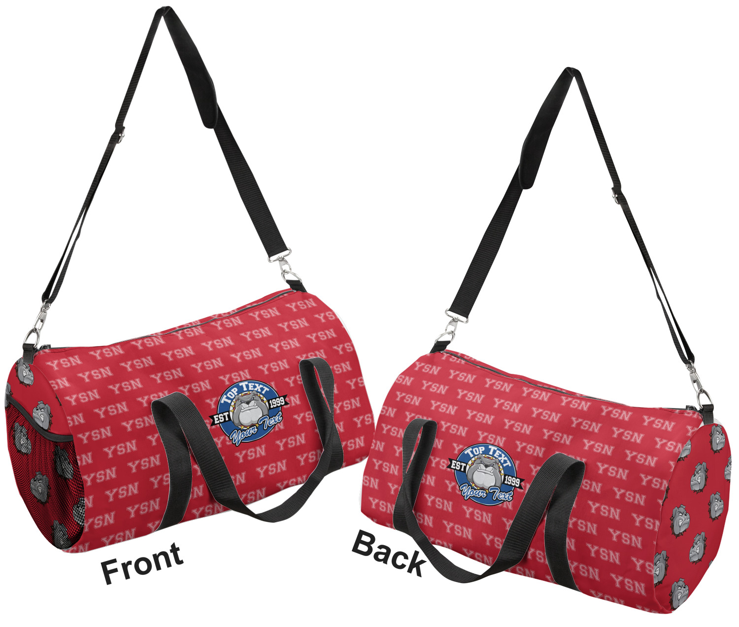 This duffle is a sturdy bag made of a canvas material. It comes in two sizes: Small (19"W x 9.5"H x 9.5"D) and Large (23"W x 12"H x 12"D). The bag is a cylindrical shape with a black adjustable strap and two handles. On one side is an elastic pouch to put a waterbottle or other small item. Your product will be sublimated with your design and is able to be designed on the front, back, and sides. Be sure to remember that the straps may cut into parts of your design if you upload your own artwork.