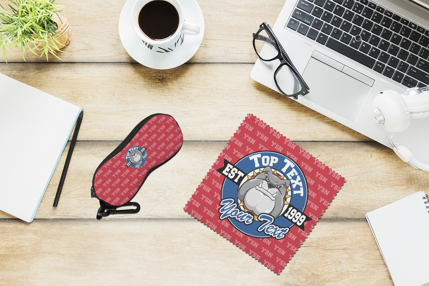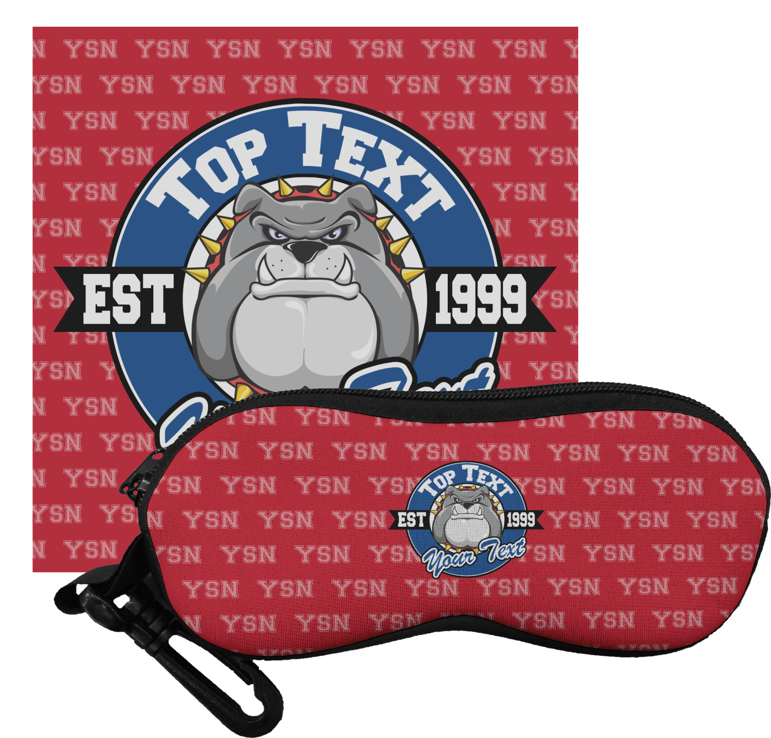 For products that use the background, let's start with the background - we show your school's initials on the red background. You can change the color of the background to your school color, you can change the initial to your school's initial. We also have a background with the mascot, that would look great on this design. And we have 1000's of patterns (e.g.plaid) that you can also use and recolor to your school colors.