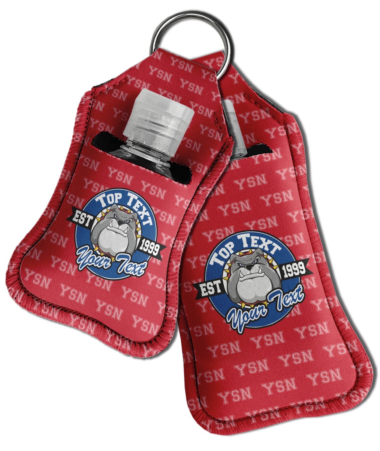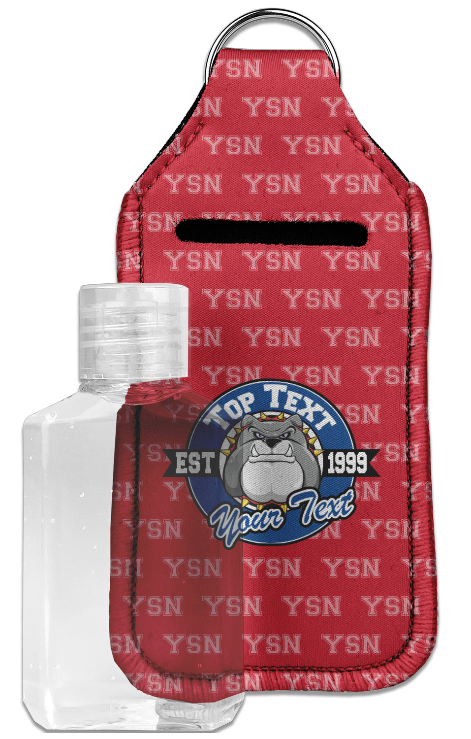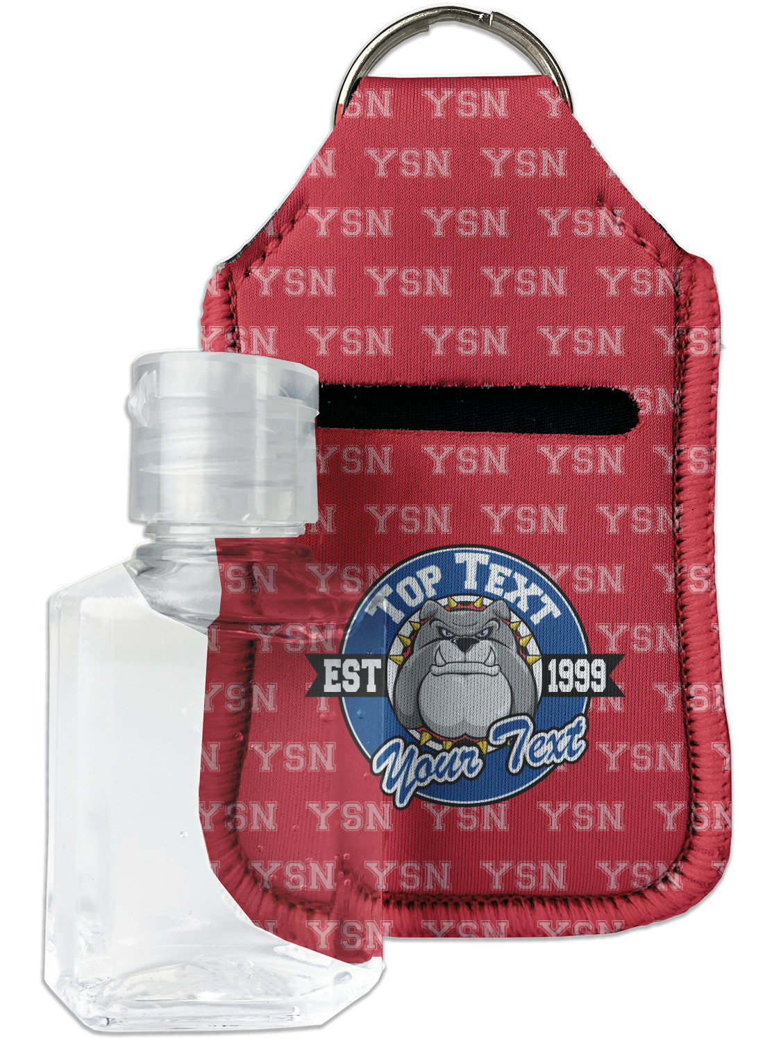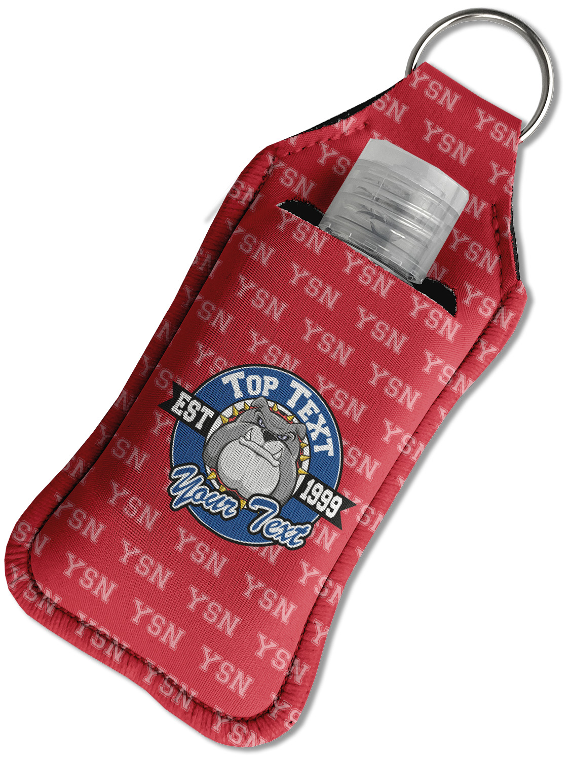 Each hand sanitizer holder comes with its own empty travel-sized, refillable hand sanitizer sure to fit snug in your customized sanitizer case! Our hand sanitizer cases are a durable, yet soft neoprene material sure to last any daily activities or travel agenda. Customize and personalize a hand sanitizer bottle holder with one of our two sizes - small (4.25" x 2.25") or large (5.5" x 2.5"). Each travel sanitizer holder comes with a keyring for attachment on bags, keys, or more!