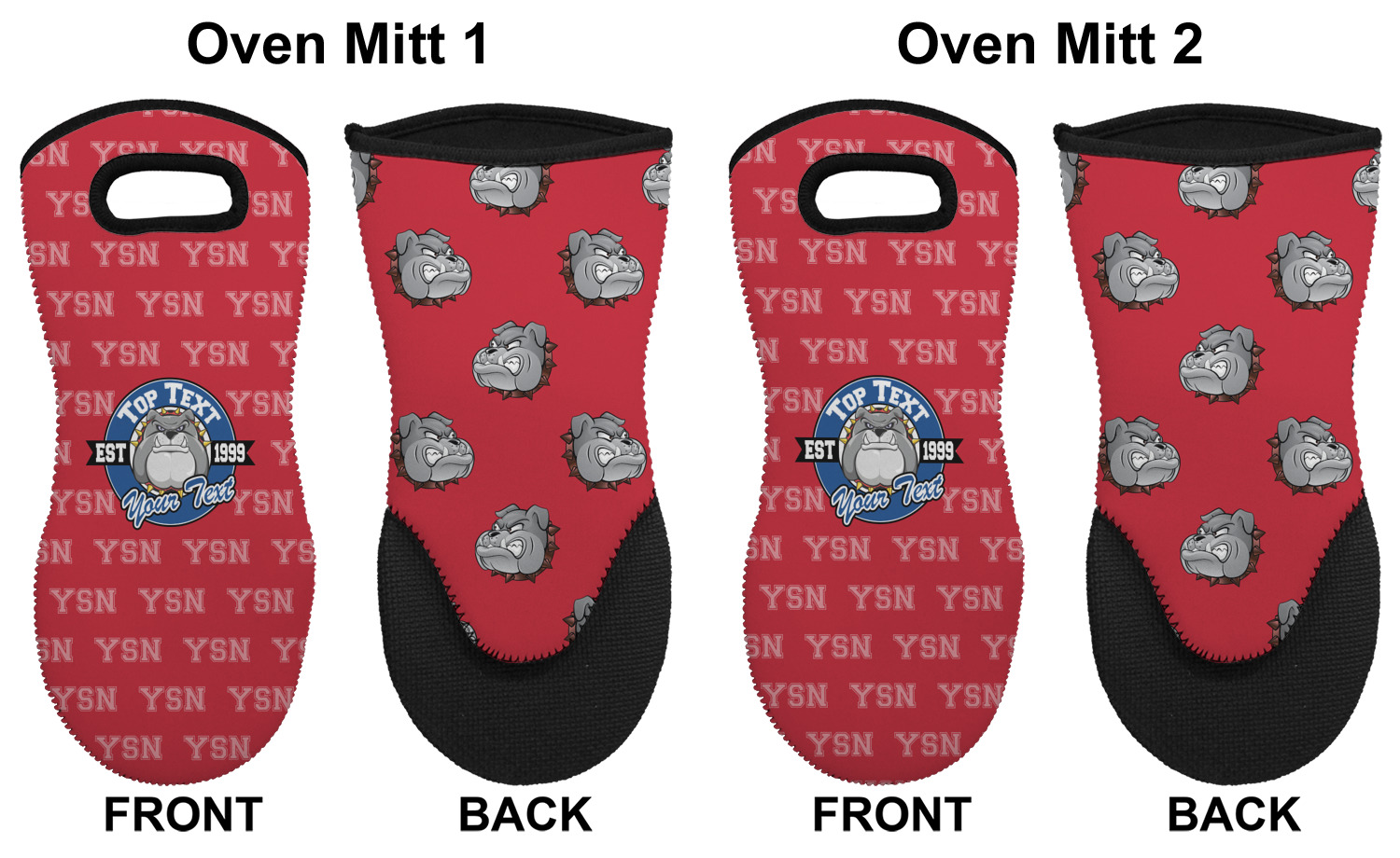 These heat resistant gloves are made entirely of a durable neoprene; the front features a softer texture, while the palm's side has a textured surface, meant to handle heat up to 500 degrees Fahrenheit. Thick, heavy duty stitching connects the two sides. A small, oval cutout appears on the front, and can be used to hang and store the mitt. Your personalization appears on the front, and the upper part of the back of the mitt. The style of these oven mitts are suitable for both the right and left hand, depending on your needs. If you need one for each hand, be sure to order two!