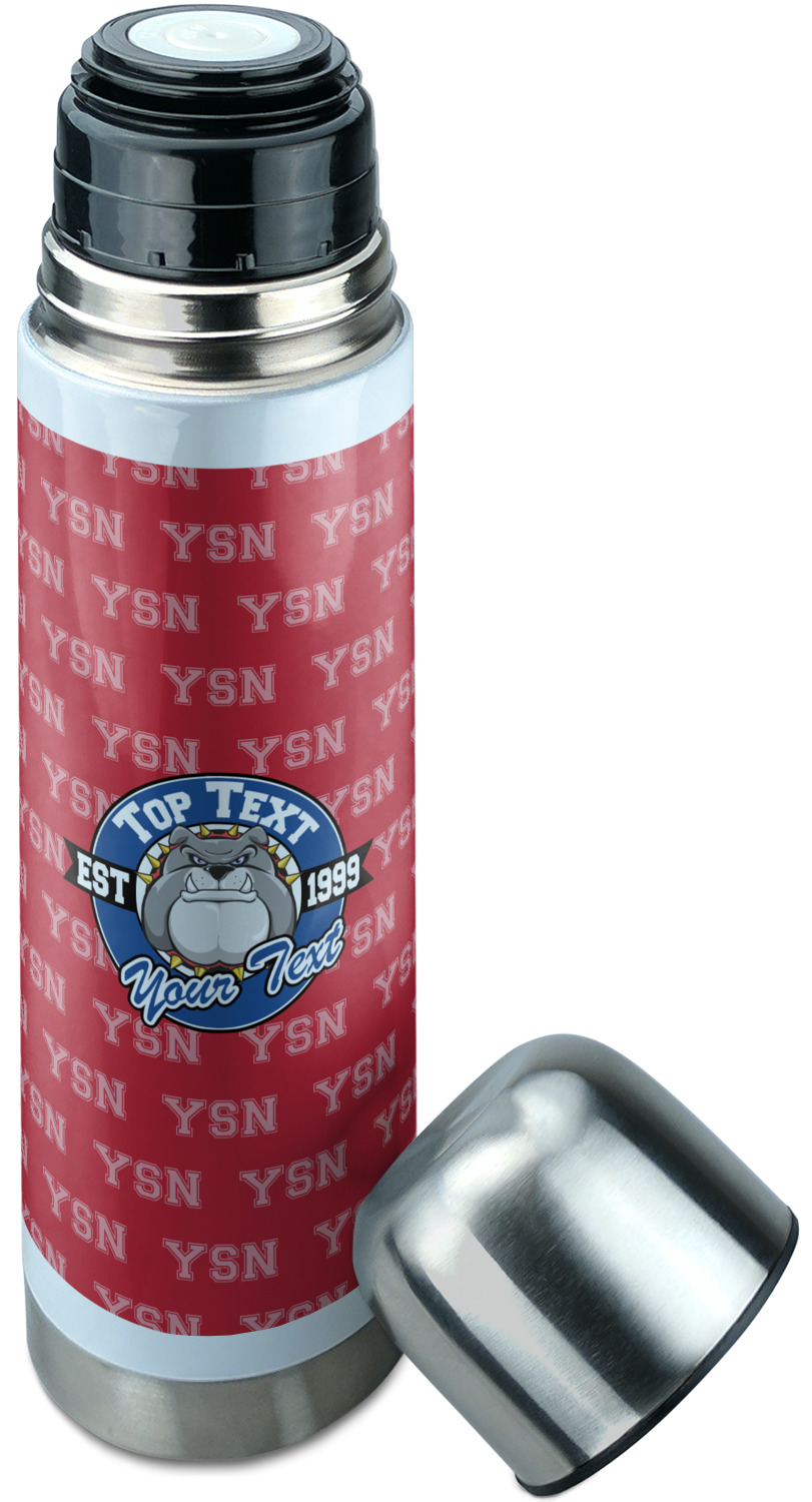 Manufactured from stainless steel, this thermos is built durably and double-walled insulated to preserve the temperature of your drink for hours. It also features a screw off lid that is made to also function as a small cup. Upon unscrewing this part of the thermos bottle, a pop-open, pour feature emerges. This feature allows you to slowly pour your beverage into your lid, ensuring a steady, controlled pour into your lid or other cup. With a capacity of 25 ounces, these large thermoses can hold several servings of your favorite beverage. Your customization is displayed all around the bottle with bright, vibrant color.