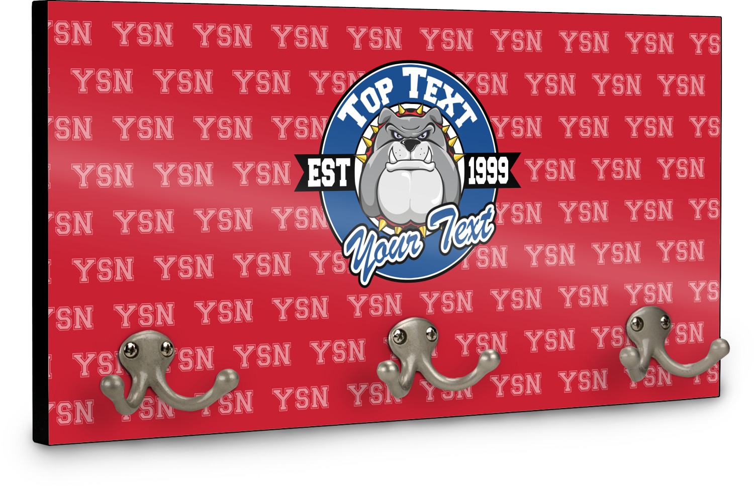 This coat rack is the perfect way to add some personality to your wall or entryway. The board is made of a strong maple that is approximately 16" x 8". The three 2-prong hooks are a sturdy metal that have three screws attaching them to the board. Your design is printed right onto the front of the board while the back and sides are a simple black.