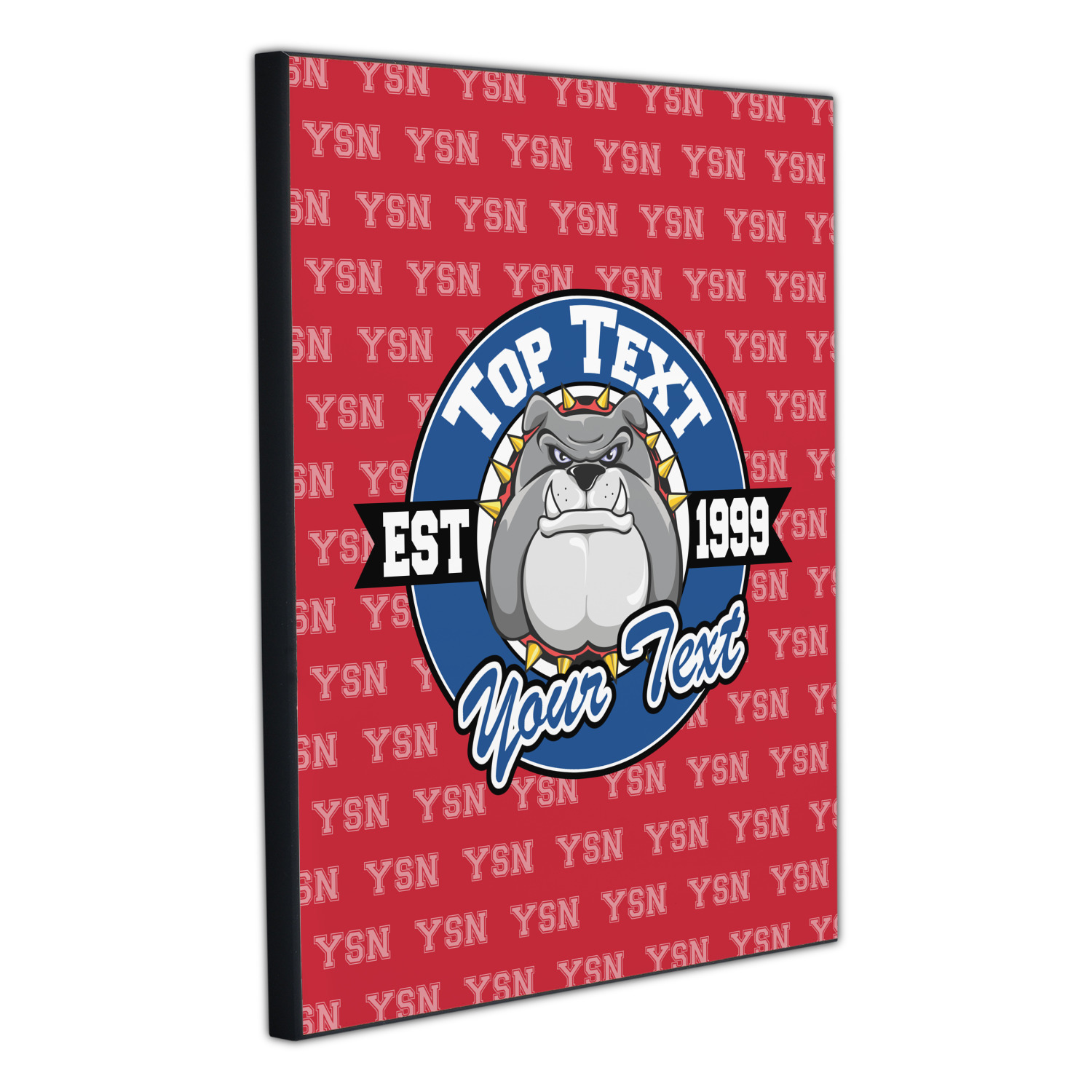 For products that use the background, let's start with the background - we show your school's initials on the red background. You can change the color of the background to your school color, you can change the initial to your school's initial. We also have a background with the mascot, that would look great on this design. And we have 1000's of patterns (e.g.plaid) that you can also use and recolor to your school colors.