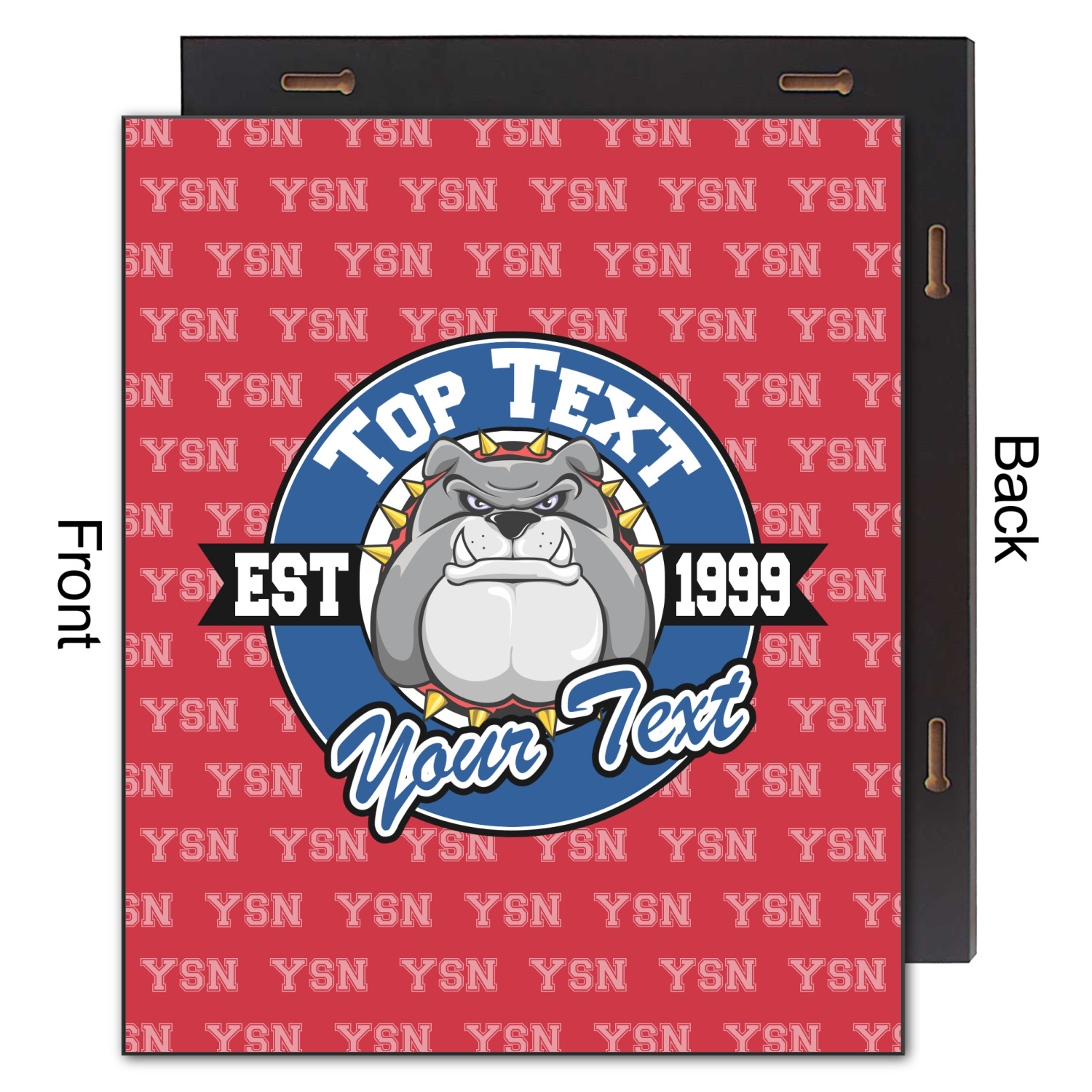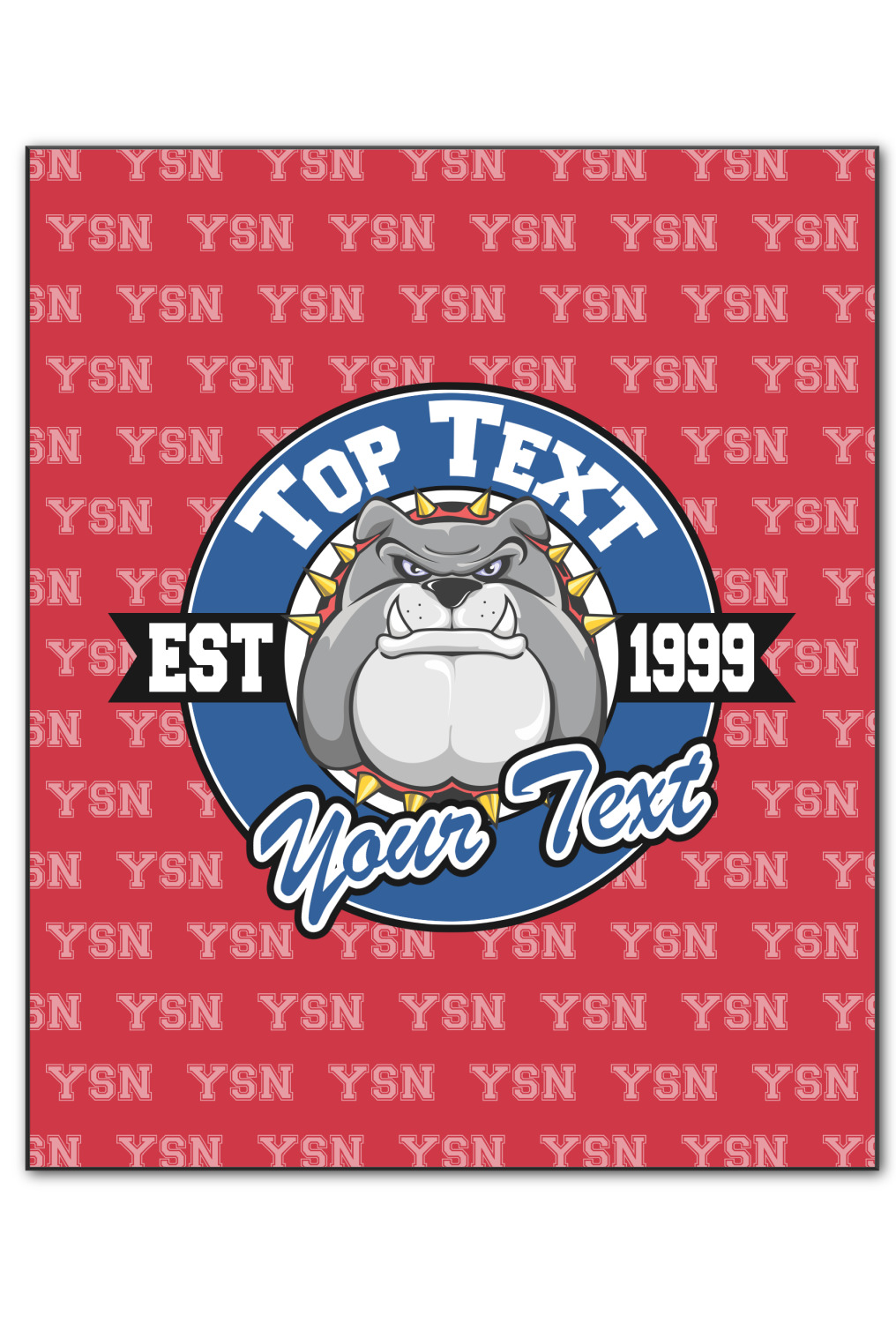 The foreground has a beautiful badge that can be changed to you second school color. There are two locations for the text and one for year your school was established - we recommend putting your High School name on top and your mascot name on the bottom. The mascot face is also customizable. We have 100's of mascots in our system for you to choose from.