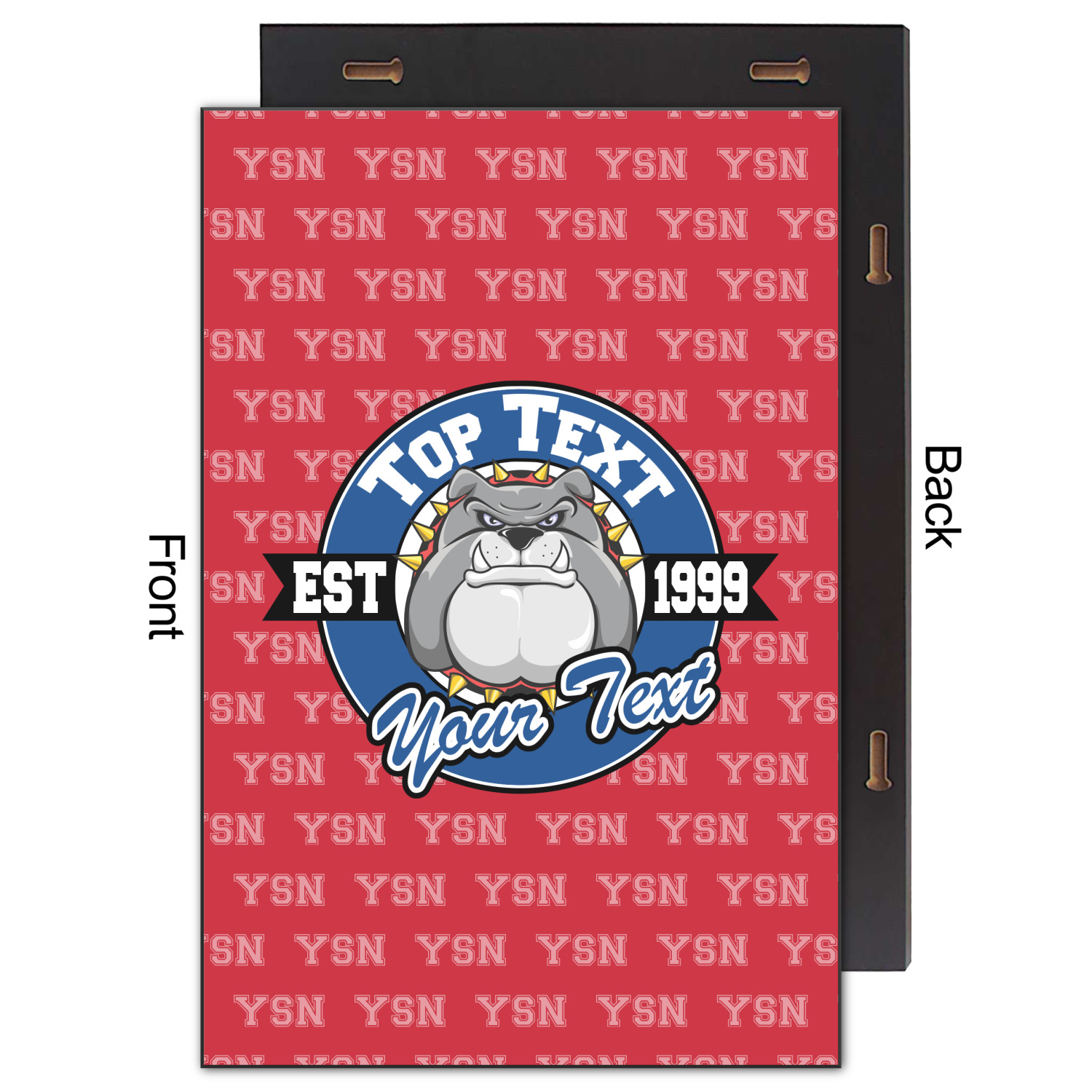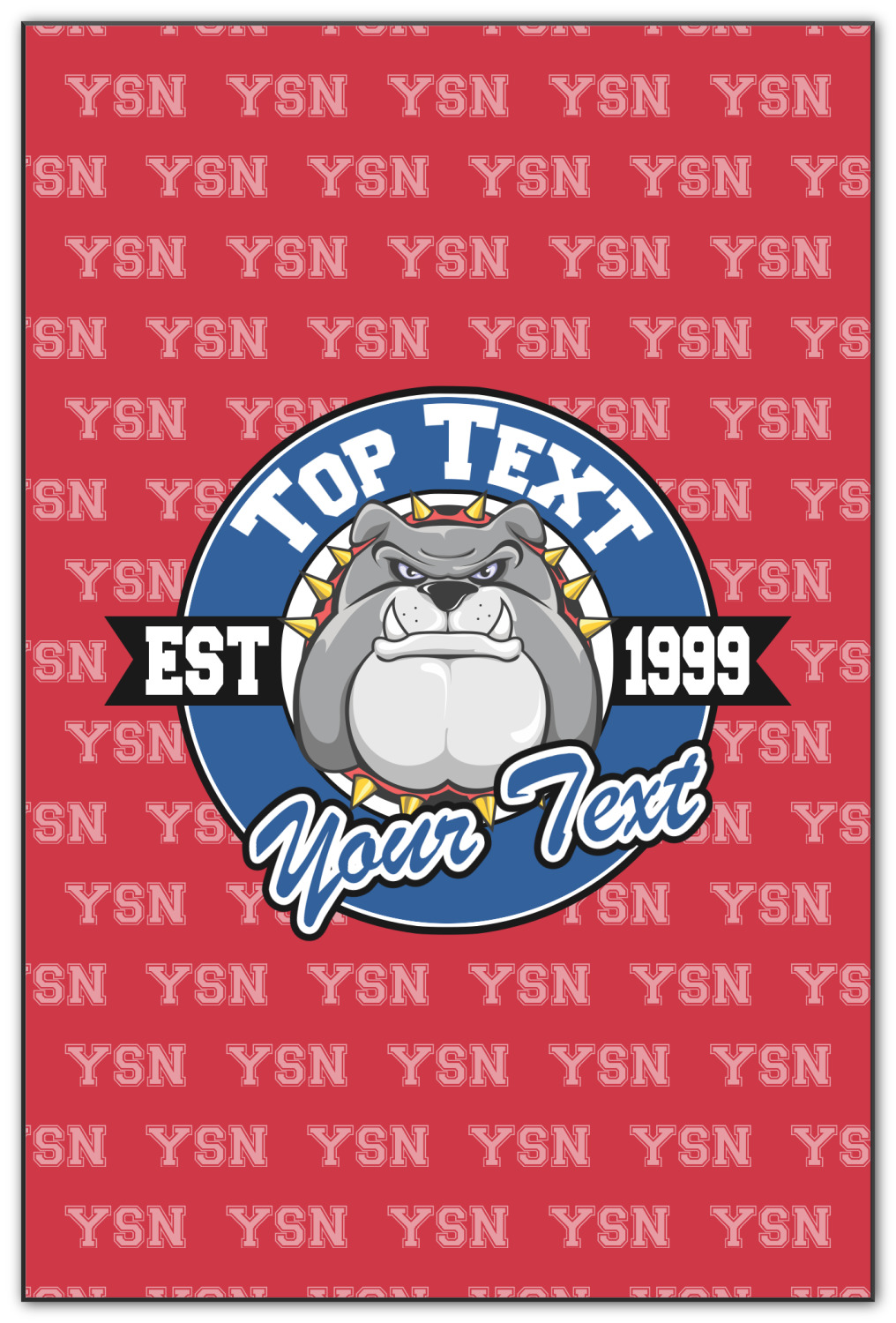 The foreground has a beautiful badge that can be changed to you second school color. There are two locations for the text and one for year your school was established - we recommend putting your High School name on top and your mascot name on the bottom. The mascot face is also customizable. We have 100's of mascots in our system for you to choose from.