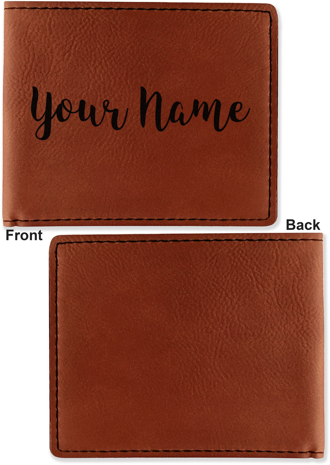 Your bifold wallet will be personalized by laser engraving, which will be a black color on the wallet. Choose a graphic, text, or monogram to personalize your wallet. There are thousands of choices in our design center.