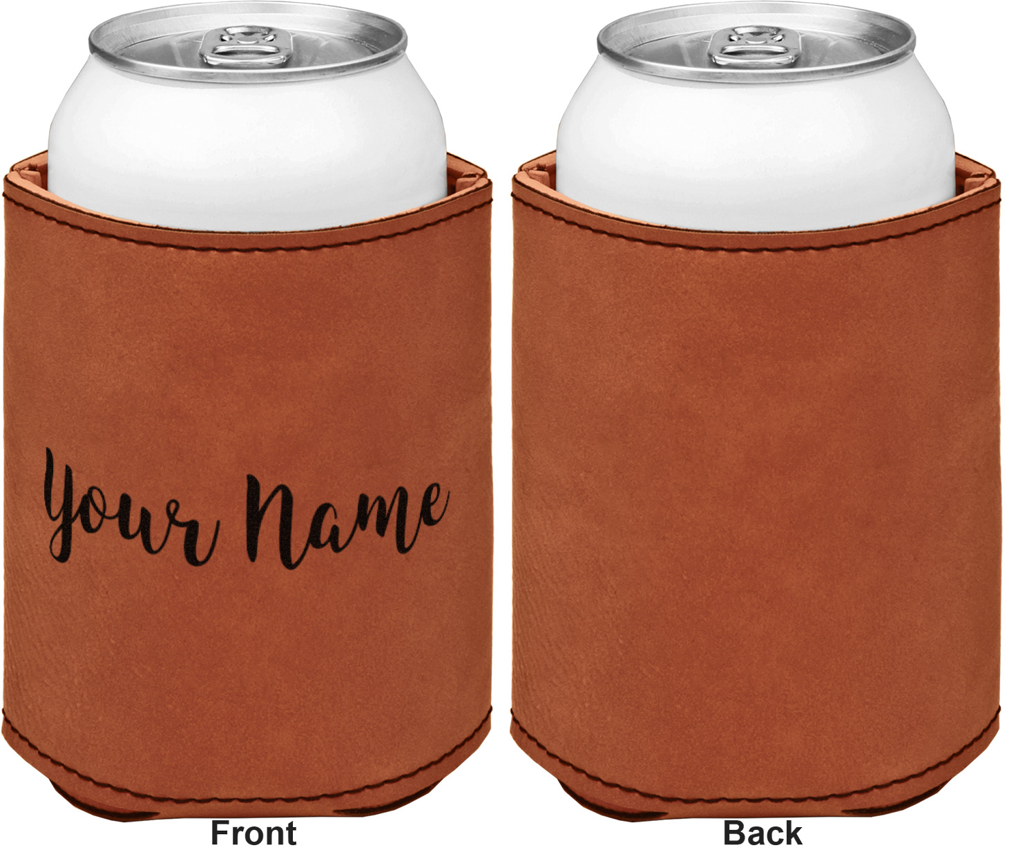This can sleeve is made from a cognac-brown leatherette and stitched with a sturdy, black thread. A slim padding lines the inside of your can sleeve to allow for a better fit once your drink is inserted. The sleeve itself measures at 4 by 4.5 inches, allowing this custom can sleeve to accommodate most canned drinks. Your personalized design can be engraved on the front and back, or solely the front. When laser-engraved, your design appears as a black coloration which contrasts the leatherette nicely.