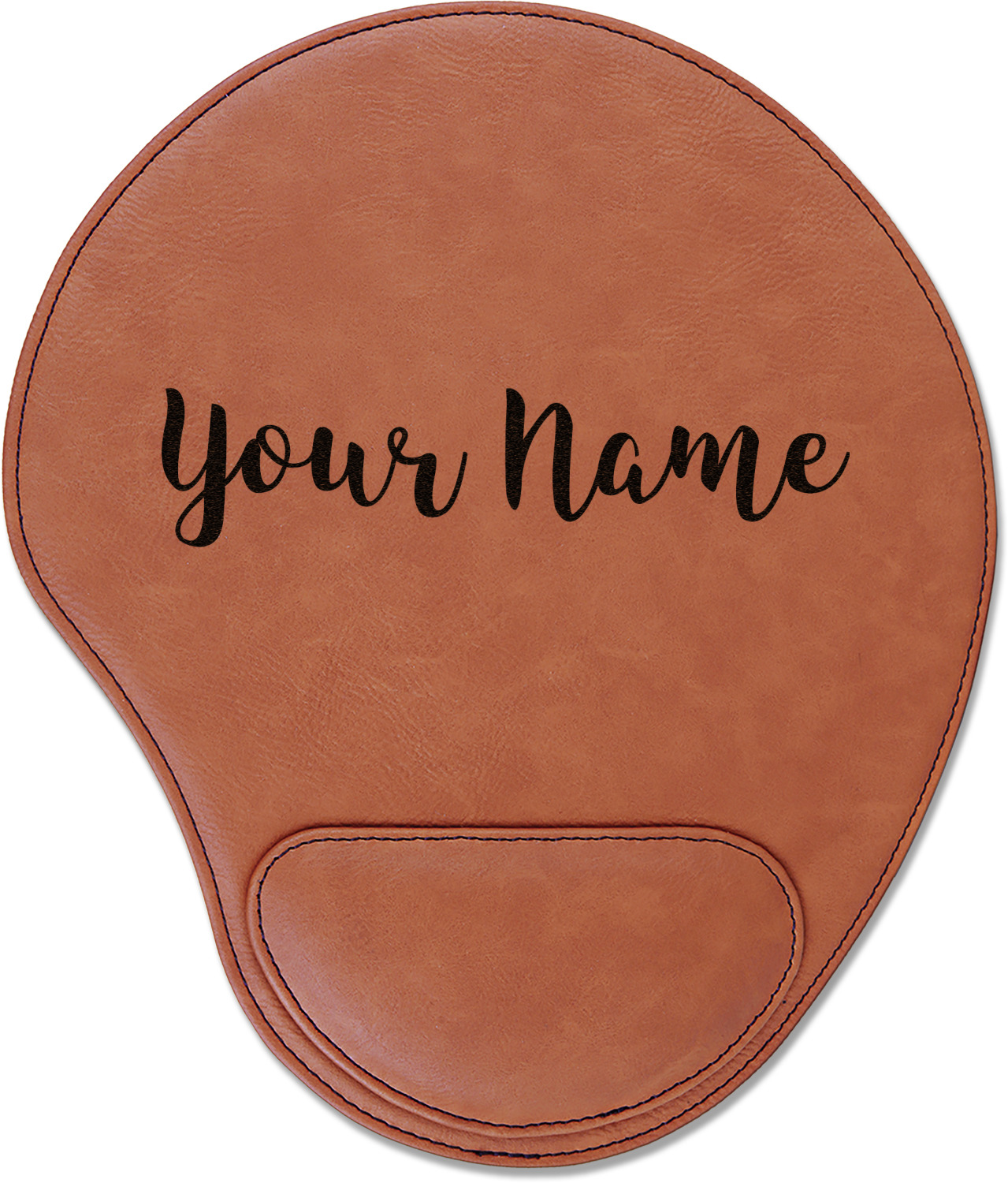 In a rounded shape, this mouse pad is made of a luxurious, cognac-colored leatherette. The nature of this material allows your mouse to glide smoothly across its surface. Strong stitching lines the edges to guarantee stability and strength. As added support for tired wrists, your personalized mouse pad features a supportive wrist rest at its bottom. This model measures at 10.25" x 9", while its wrist pad is approximately 5" x 2.75", with a thickness of 0.75". Your personalized design is laser engraved into the front face of this mouse pad.