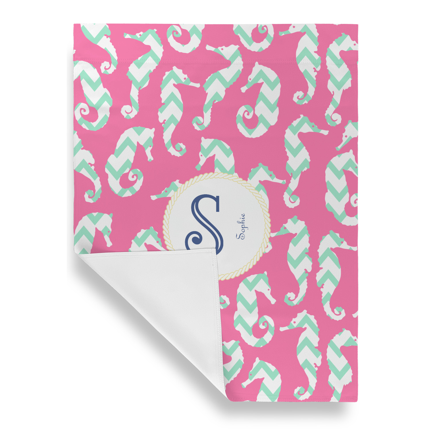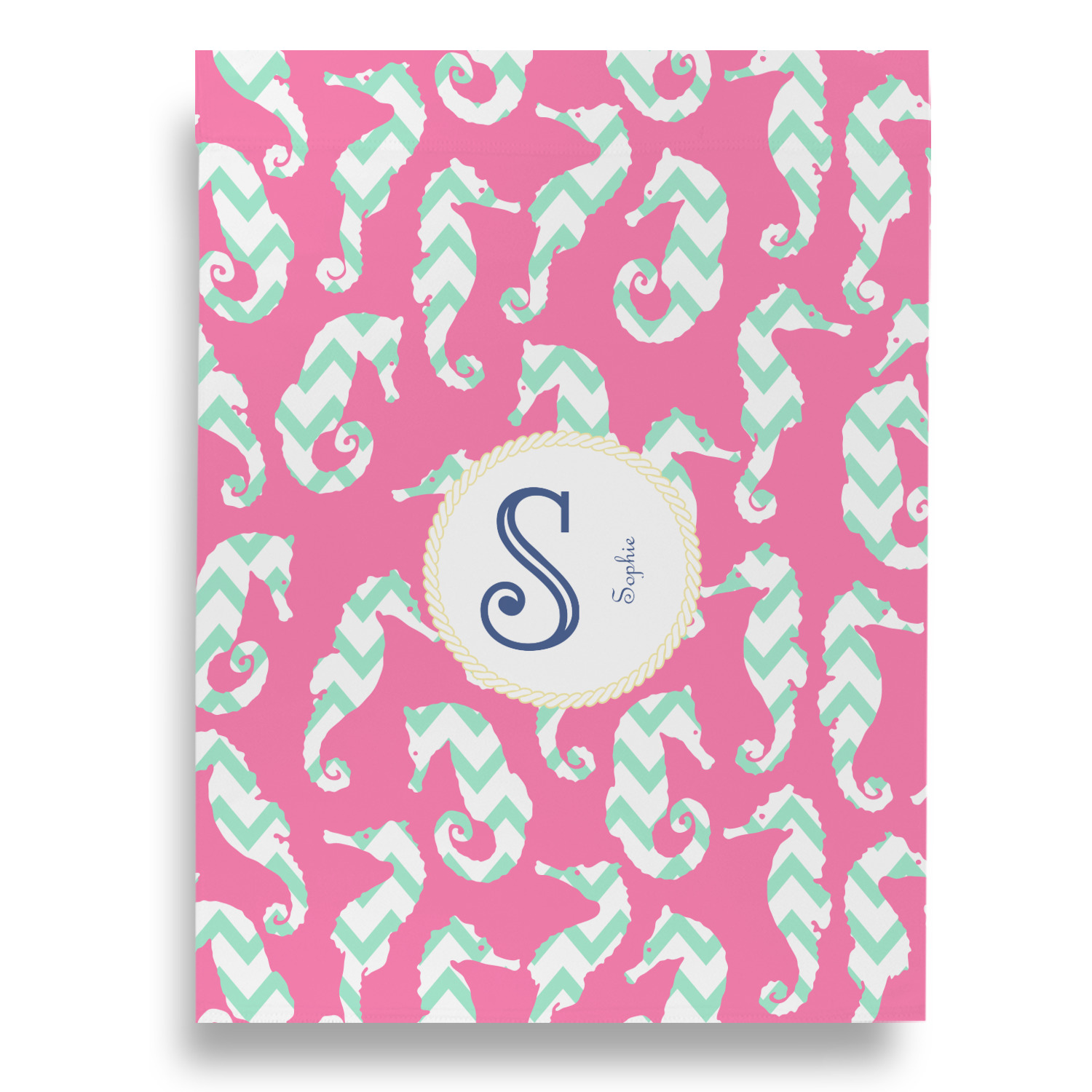 This sea horse design combines the beauty of seahorses with the fun loving chevron pattern. The design features mint, a bubble gum pink background and some gold colors, all of which can be customized to your favorite colors with just a few clicks!