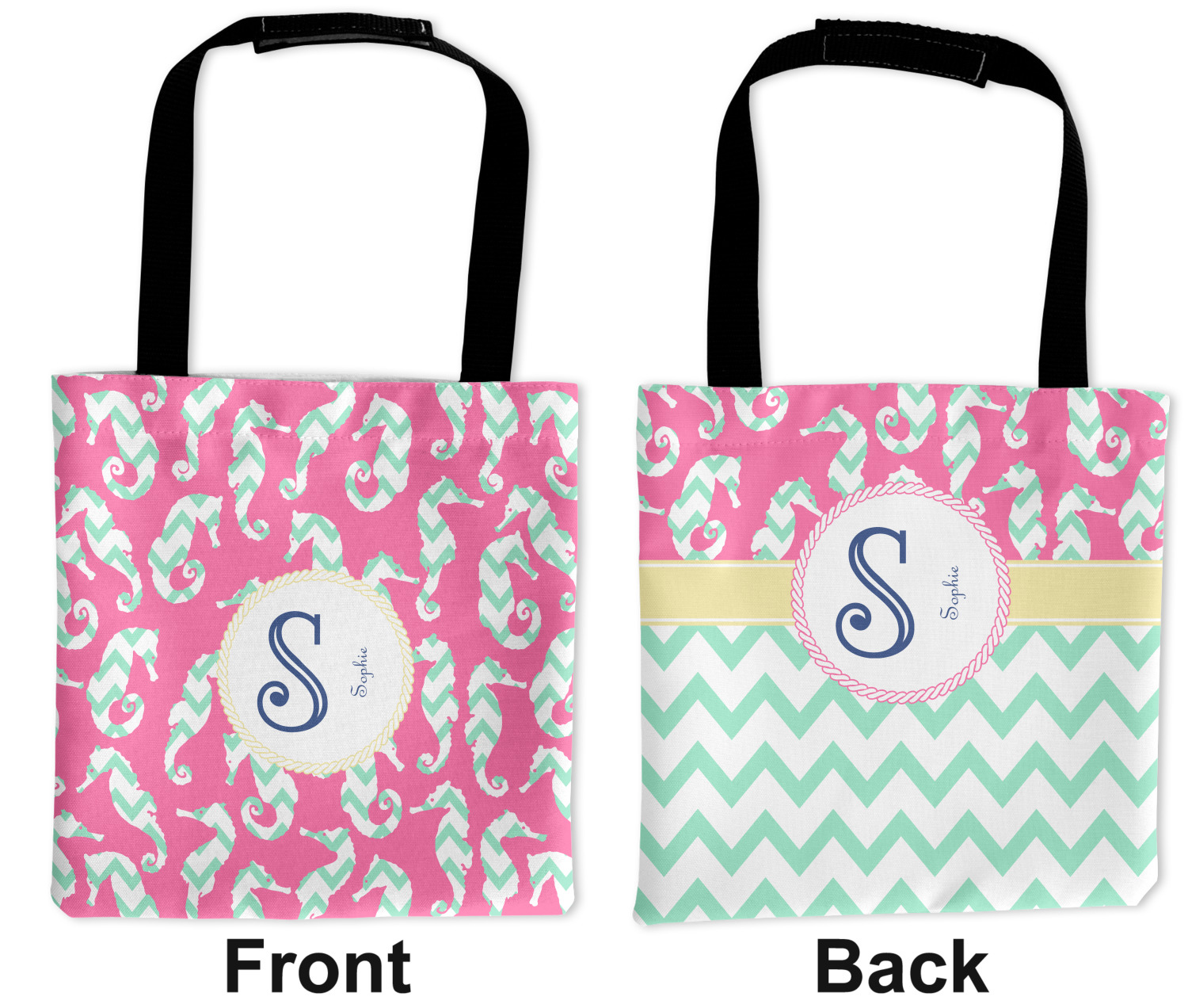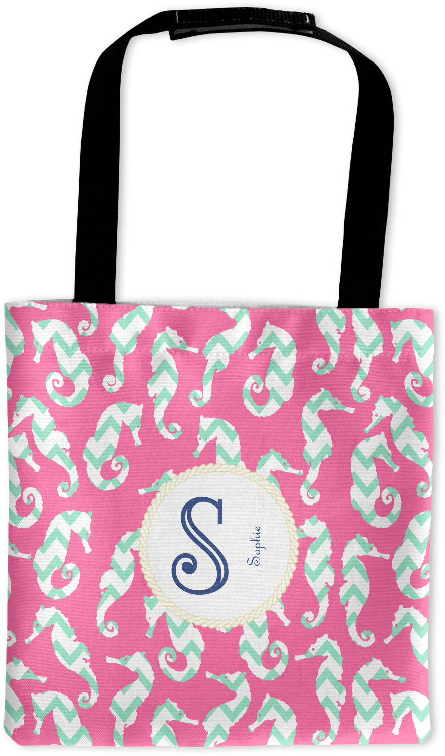 This sea horse design combines the beauty of seahorses with the fun loving chevron pattern. The design features mint, a bubble gum pink background and some gold colors, all of which can be customized to your favorite colors with just a few clicks!