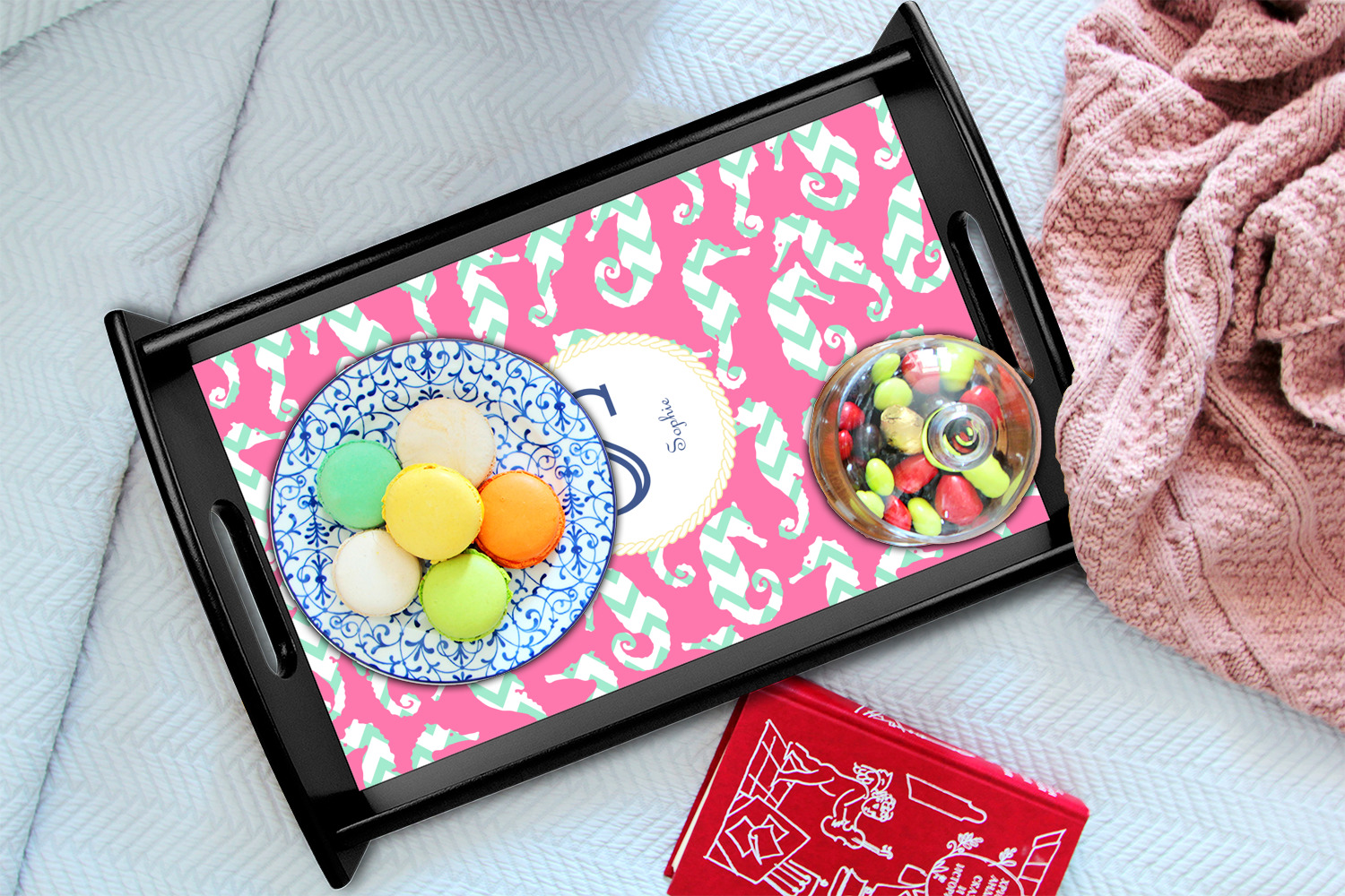 This sea horse design combines the beauty of seahorses with the fun loving chevron pattern. The design features mint, a bubble gum pink background and some gold colors, all of which can be customized to your favorite colors with just a few clicks!