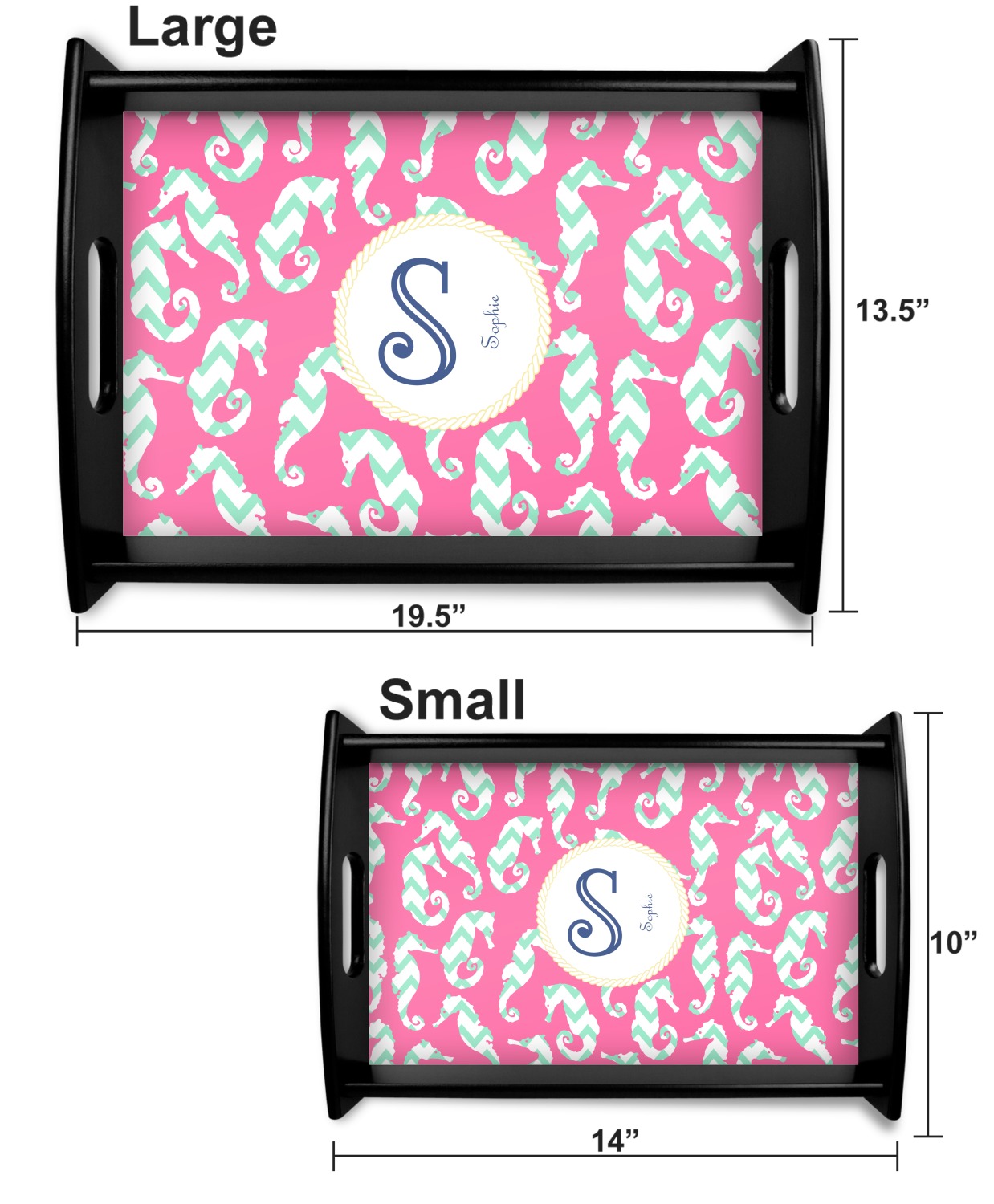 This serving tray with handles features square edges and two rounded sides, creating a very modern look. Each side is fabricated from a beautifully cut, natural wood. The bottom of the interior of the tray displays your customized design in bright, vibrant color. The tray is sold in both a black color and a natural wood look. Each variation of the wood serving tray has two sizes: Small, which is 14" x 10" x 2.25", and Large, which is 19.5" x 13.5" x 2.75".